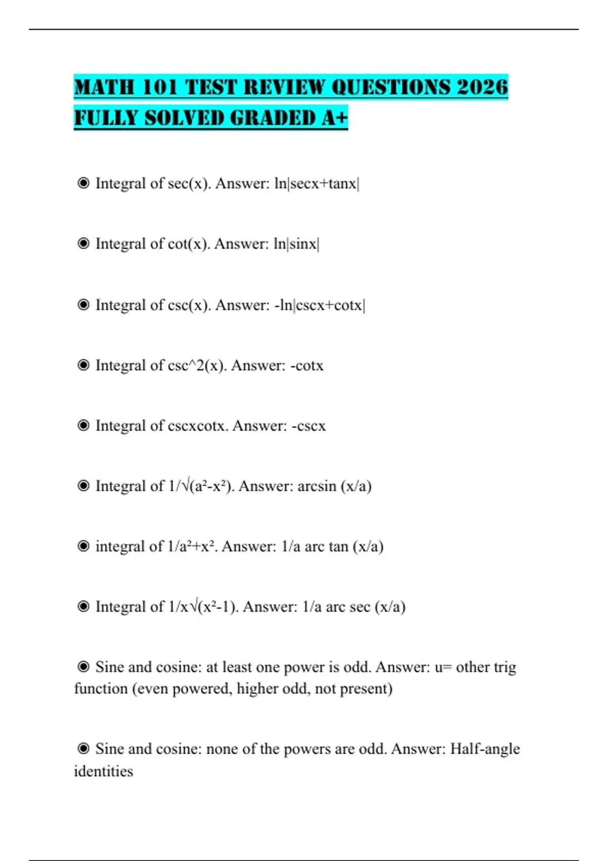 MATH 101 TEST REVIEW QUESTIONS 2026 FULLY SOLVED GRADED A+