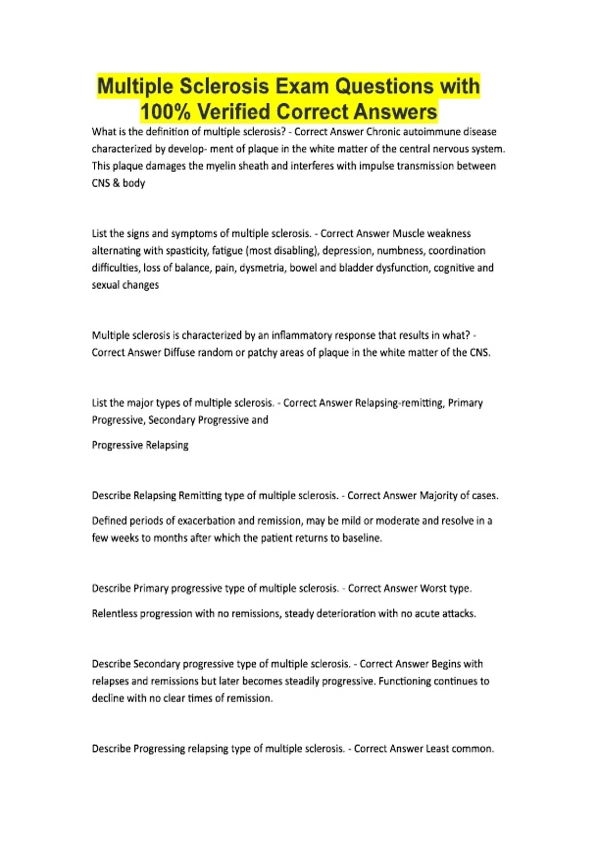 Multiple Sclerosis Exam Questions with 100% Verified Correct Answers