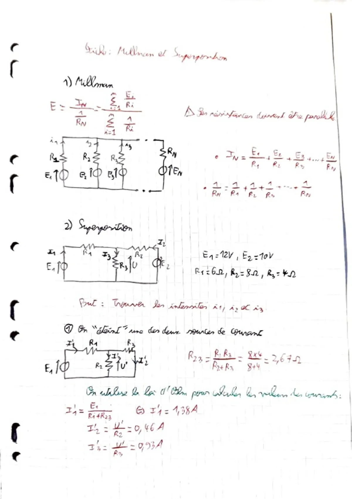 Tu bloques sur des circuits avec trop de générateurs ? Cette fiche n°3 te donne les outils de réduction les plus puissants pour gagner un temps précieux en examen. Ce que tu trouveras dans cette fiche : Le Théorème de Millman : La formule magique expliquée pour trouver la tension à un nœud en une seule ligne. Inclus : l'astuce pour ne plus se tromper sur le dénominateur ! Le Principe de Superposition : La méthode pas-à-pas pour décomposer un circuit complexe source par source (Indispensable pour le DS). EXERCICE TYPE CORRIGÉ : Un exemple complet avec deux sources de tension (E1=12V,E2=10V) résolu étape par étape avec calcul des courants I1,I2,I3. Alertes "Pièges" : Les conditions de validité (résistances en parallèle) pour ne plus perdre de points bêtement. Fiche manuscrite claire, idéale pour les révisions de dernière minute