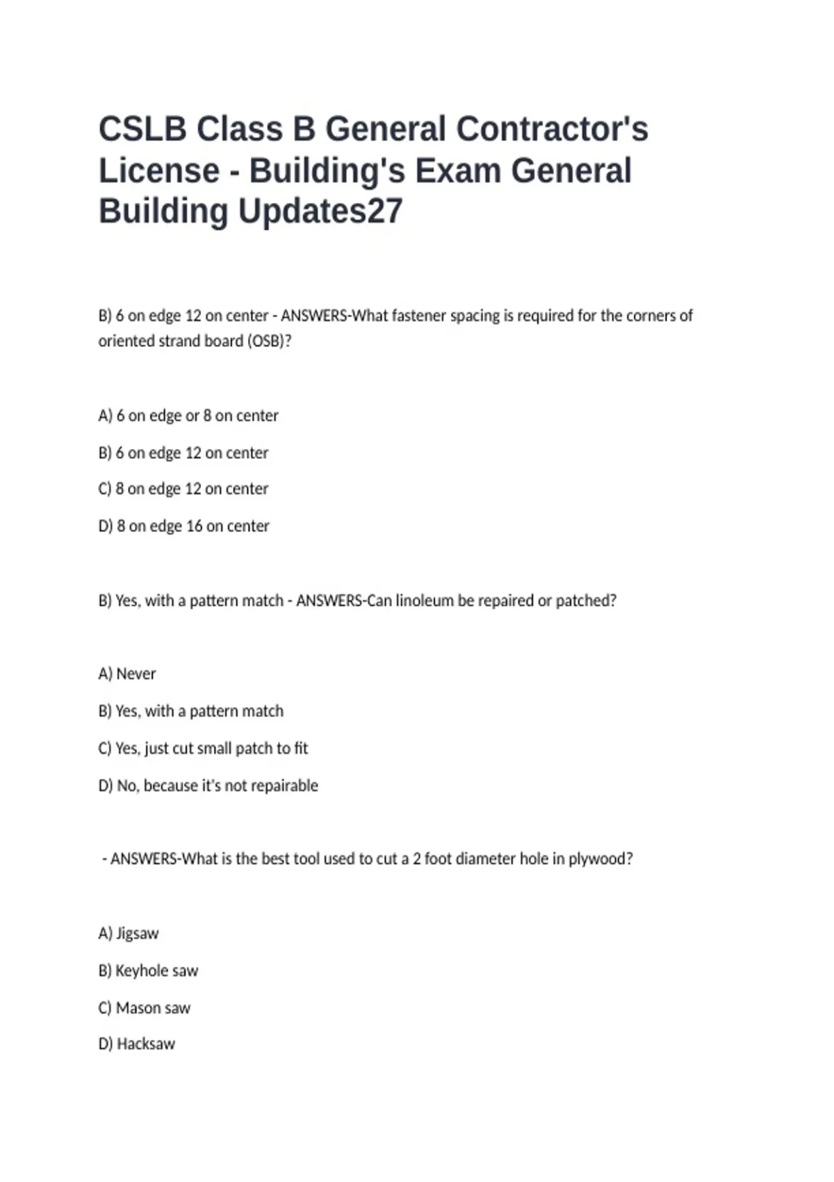 B) 6 on edge 12 on center - ANSWERS-What fastener spacing is required for the corners of