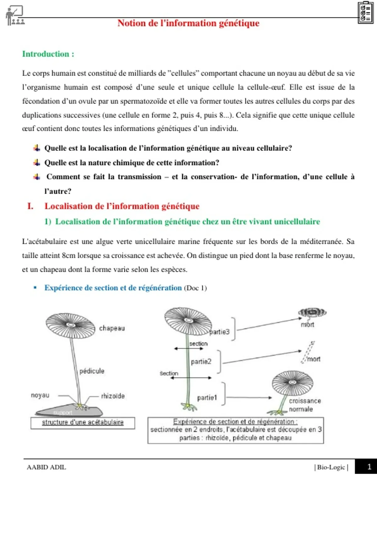 1) Localisation de l’information génétique chez un être vivant unicellulaire