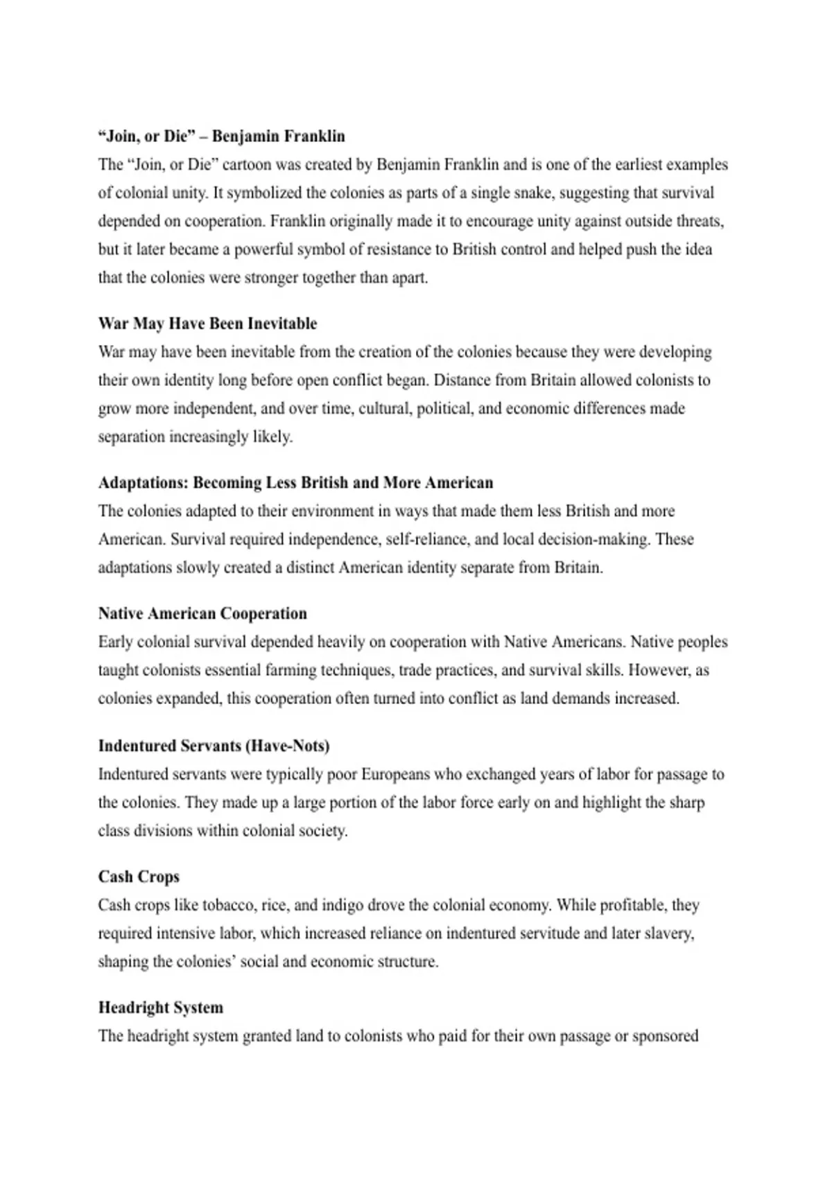 very thorough notes from the American revolution and including things like causes of war, Turing points, and very good as a study guide. Talk about conflicts throughout the colonies before hand as well.