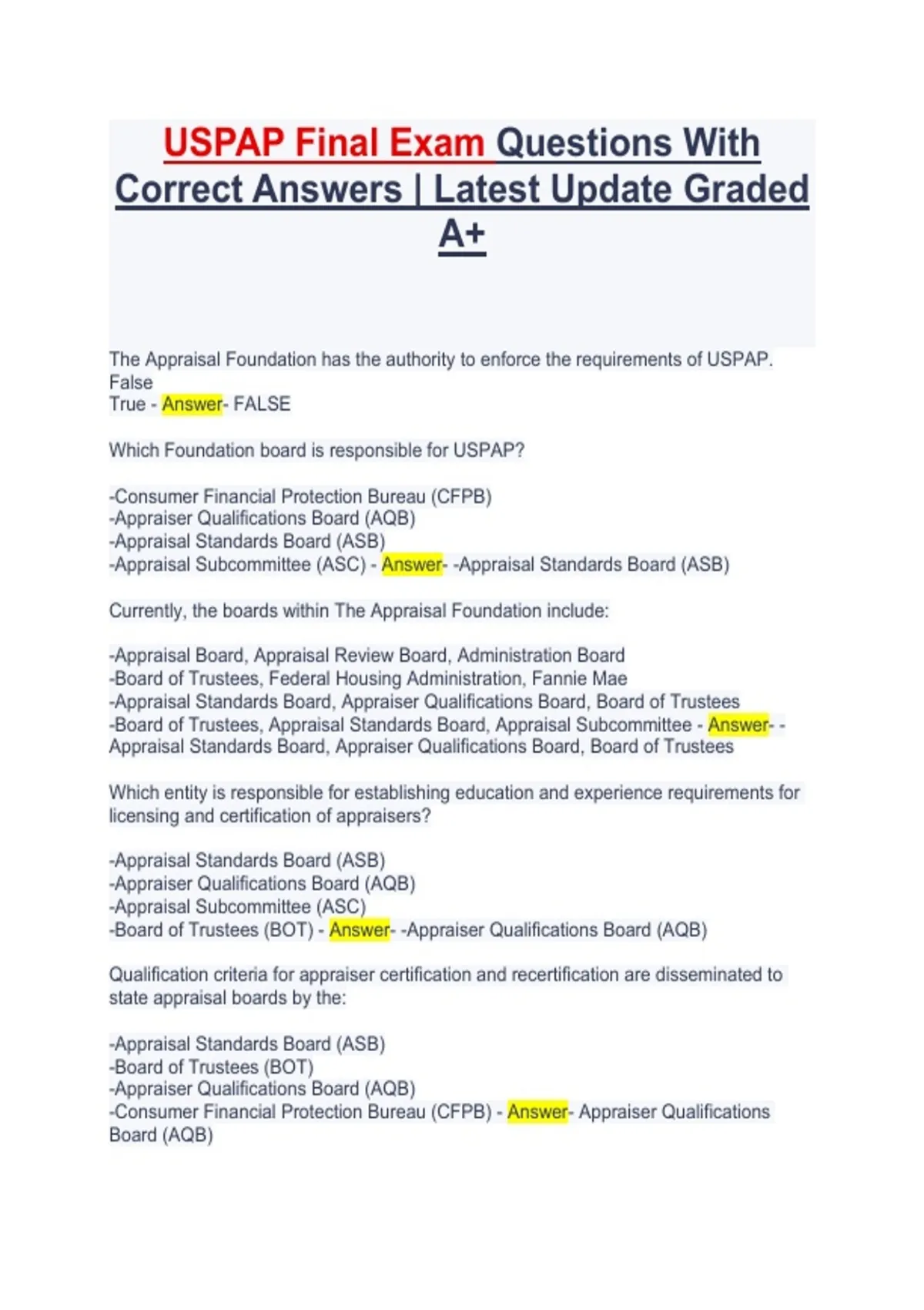 This document contains comprehensive USPAP final exam questions with verified correct answers, covering appraisal principles, ethics, scope of work, jurisdictional exceptions, appraisal development and reporting standards, appraisal review, mass appraisal, personal property, and business/intangible asset valuation. It reflects current USPAP guidance and is graded A+ with full coverage of exam-relevant concepts, making it ideal for exam preparation, refresher study, and professional reference.