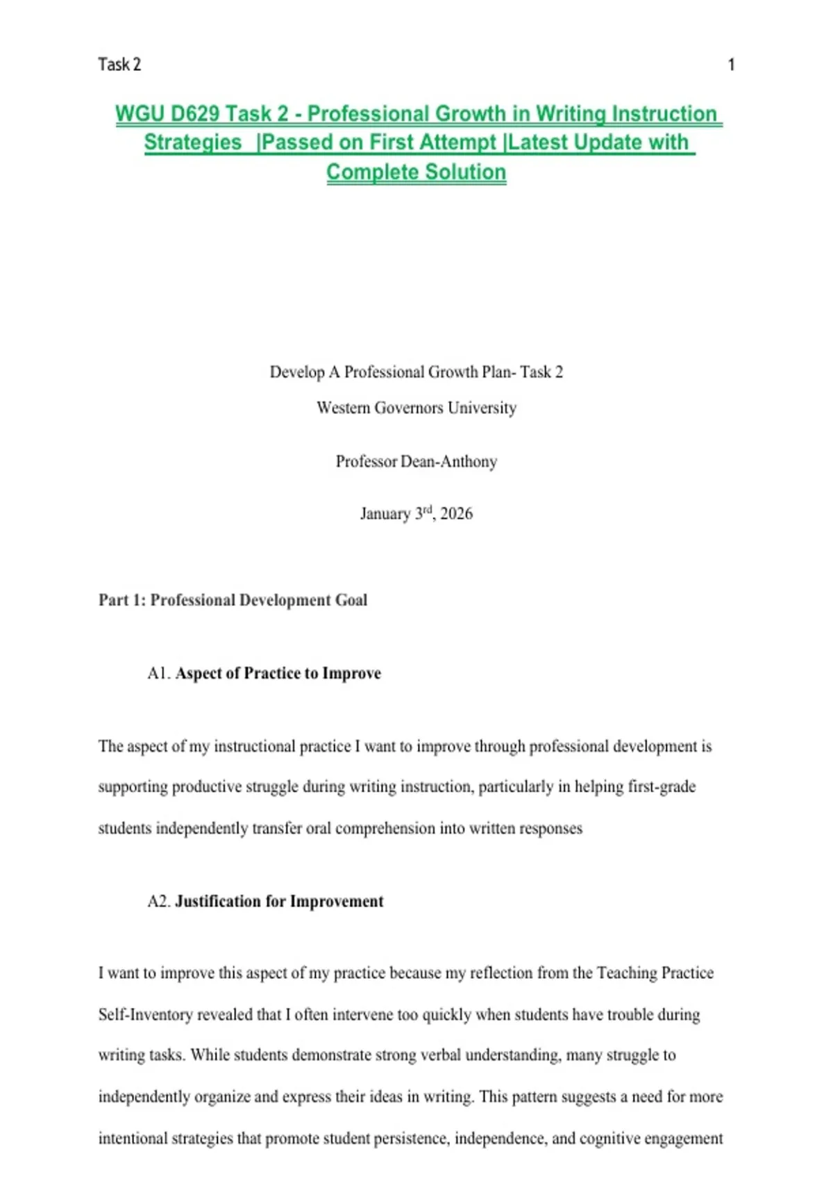 WGU D629 Task 2 - Professional Growth in Writing Instruction Strategies |Passed on First Attempt |Latest Update with Complete Solution