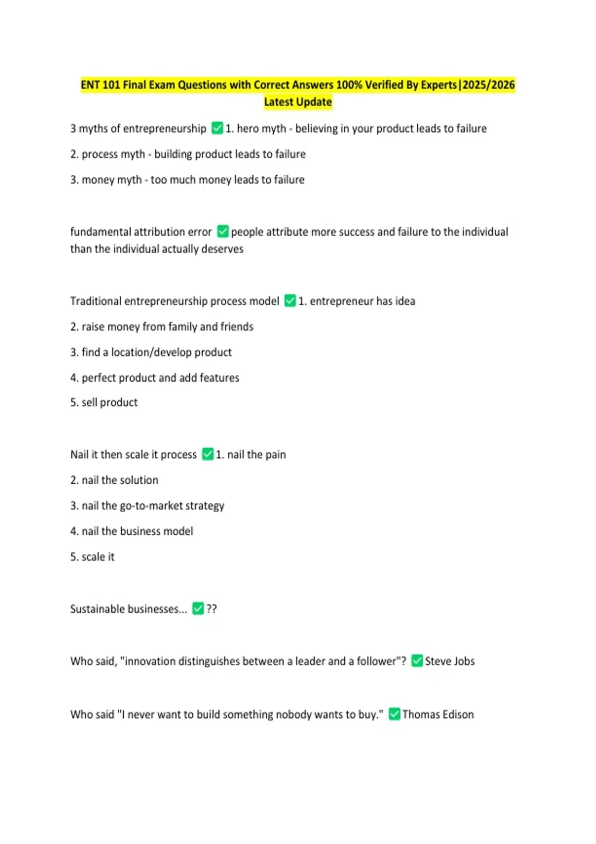 ENT 101 Final Exam Questions with Correct Answers 100% Verified By Experts|2025/2026