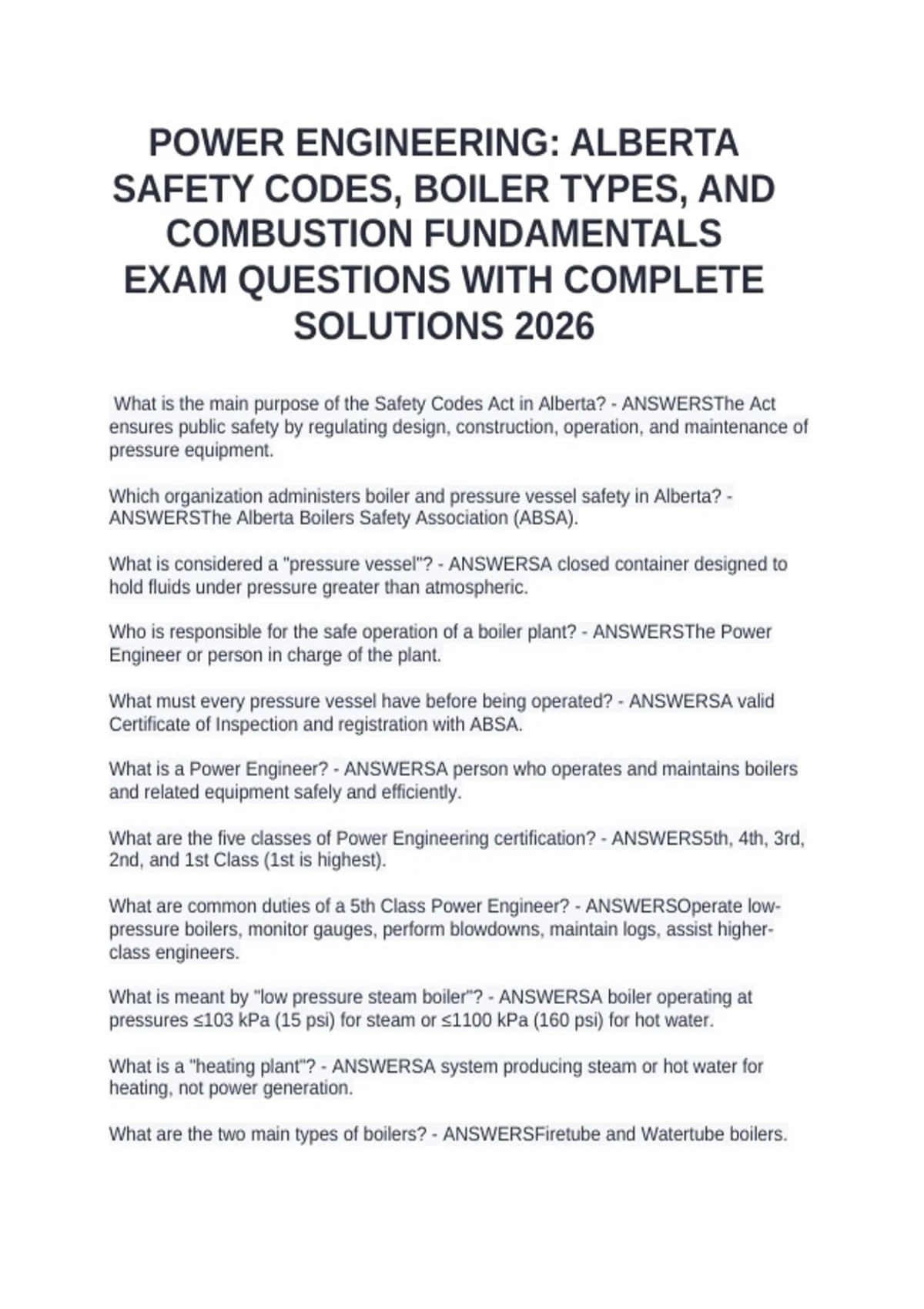 POWER ENGINEERING: ALBERTA SAFETY CODES, BOILER TYPES, AND COMBUSTION FUNDAMENTALS EXAM QUESTIONS WITH COMPLETE SOLUTIONS 2026