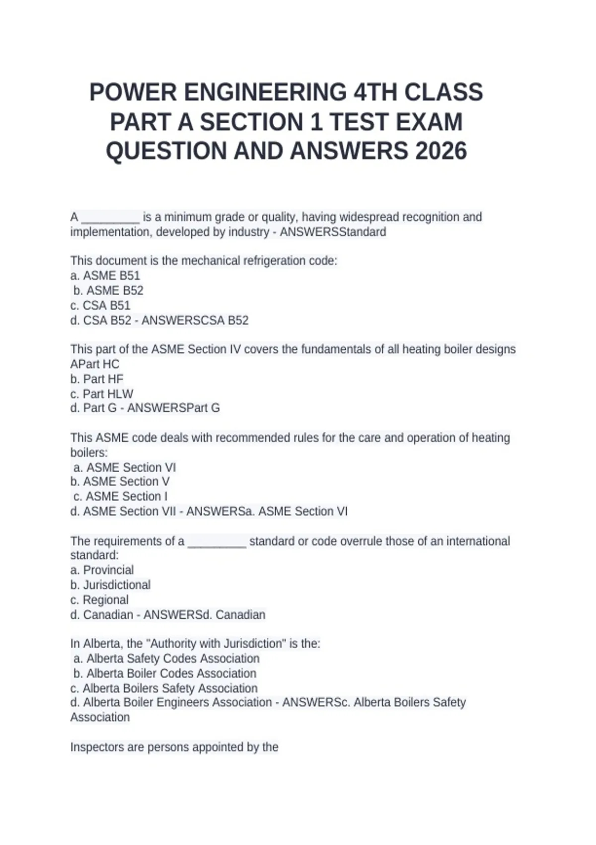 POWER ENGINEERING 4TH CLASS PART A SECTION 1 TEST EXAM QUESTION AND ANSWERS 2026