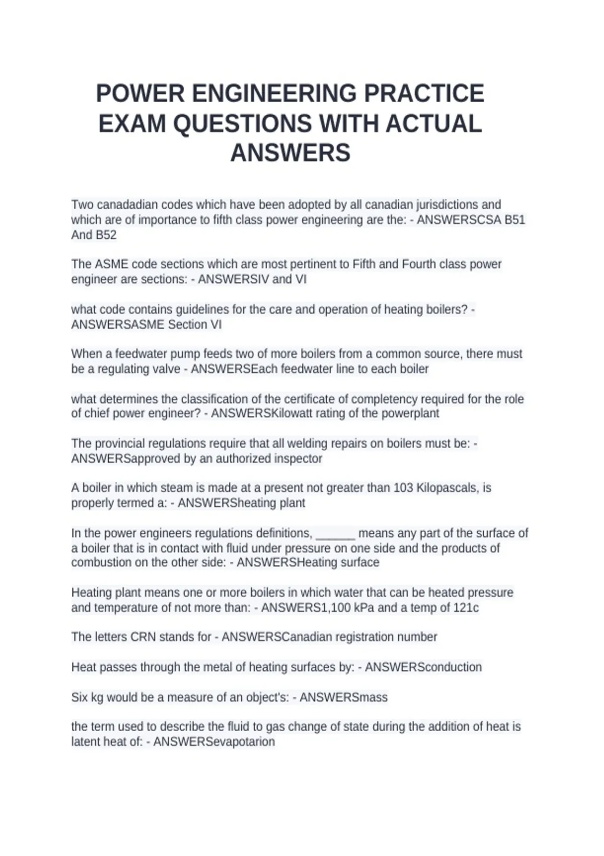 POWER ENGINEERING PRACTICE EXAM QUESTIONS WITH ACTUAL ANSWERS