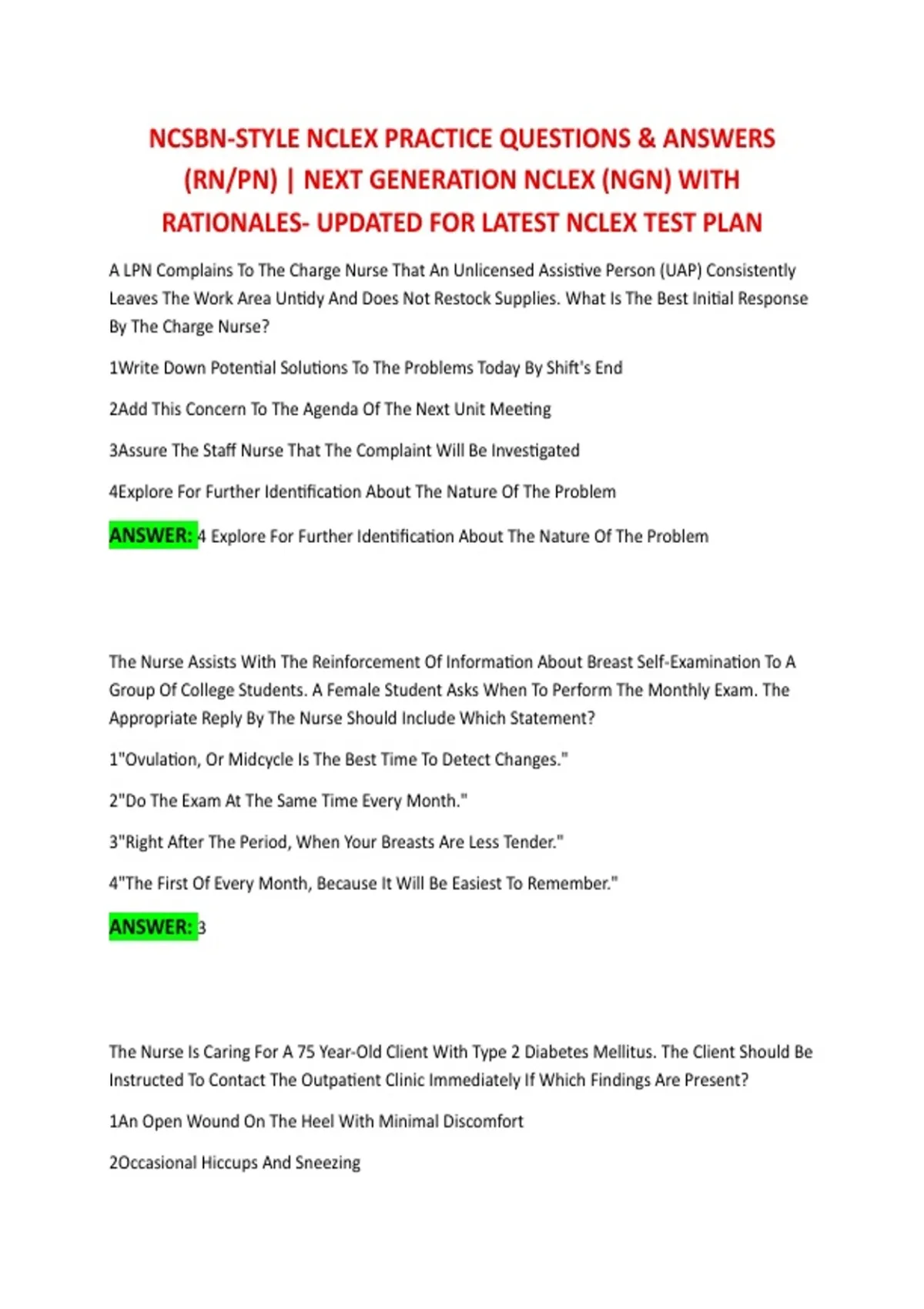 NCSBN-STYLE NCLEX PRACTICE QUESTIONS & ANSWERS (RN/PN) | NEXT GENERATION NCLEX (NGN) WITH RATIONALES- UPDATED FOR LATEST NCLEX TEST PLAN NCSBN-STYLE NCLEX PRACTICE QUESTIONS & ANSWERS (RN/PN) | NEXT GENERATION NCLEX (NGN) WITH RATIONALES- UPDATED FOR LATEST NCLEX TEST PLAN