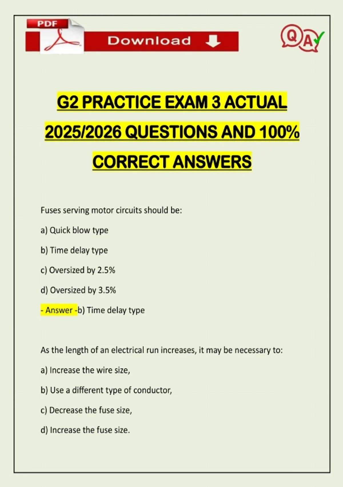 G2 PRACTICE EXAM 3 ACTUAL 2025/2026 QUESTIONS AND 100% CORRECT ANSWERS Fuses serving motor circuits should be: a) Quick blow type b) Time delay type c) Oversized by 2.5% d) Oversized by 3.5% - Answer -b) Time delay type As the length of an electrical run increases, it may be necessary to: a) Increase the wire size, b) Use a different type of conductor, c) Decrease the fuse size, d) Increase the fuse size.Need assistance on Online classes, Exams & Assignments? Reach out for instant help!! Full Course Assistance, Plagiarism-free Essay Writing, Research Paper, Dissertation, Discussion Posts, etc…. Confidential & Secure services. Tutors are available for all subjects! Email now at: - Answer -a) Increase the wire size, Millivolt wiring should be isolated from line voltage wiring because: a) The line voltage wire will overheat the low voltage wiring, b) The resistance of the millivolt wiring will be increased, c) The current in the low voltage wire will be reduced to that of the millivolt wire, d) The line voltage will induce a