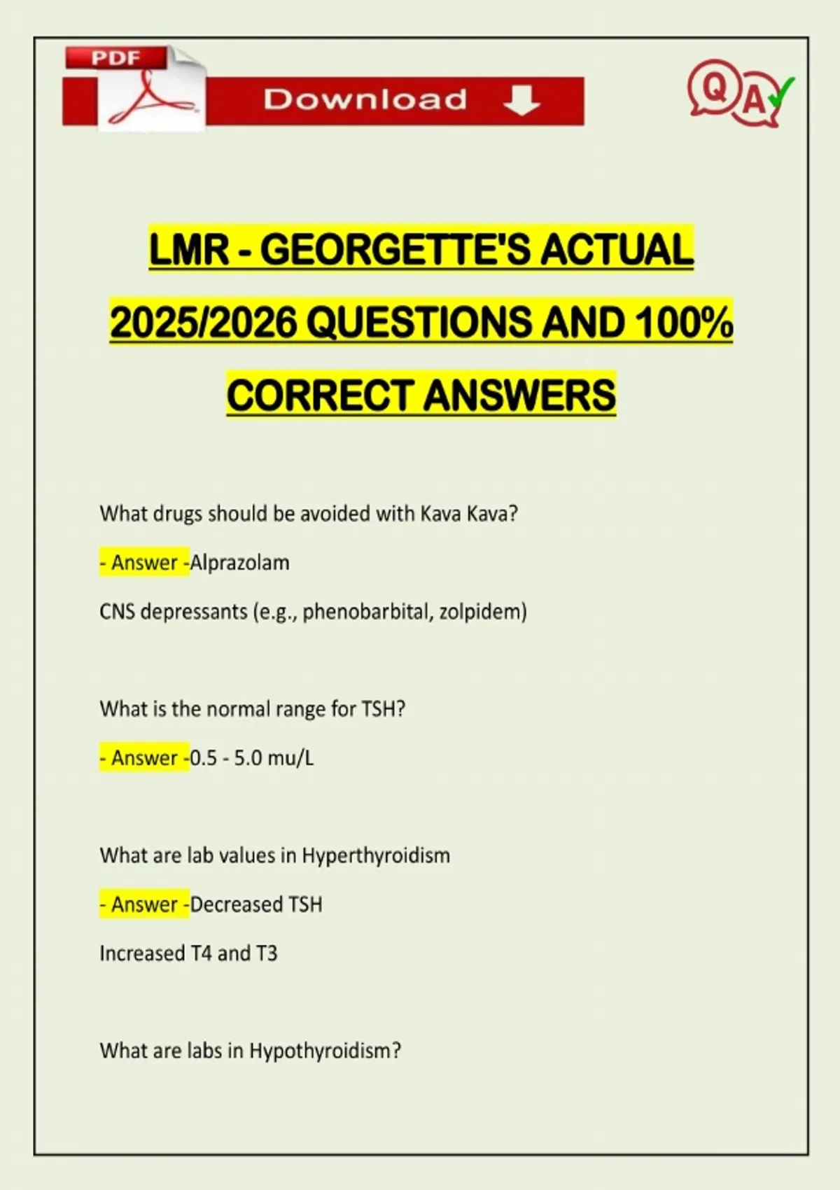 LMR - GEORGETTE'S ACTUAL 2025/2026 QUESTIONS AND 100% CORRECT ANSWERS What drugs should be avoided with Kava Kava? - Answer -Alprazolam CNS depressants (e.g., phenobarbital, zolpidem) What is the normal range for TSH? - Answer -0.5 - 5.0 mu/L What are lab values in Hyperthyroidism - Answer -Decreased TSH Increased T4 and T3