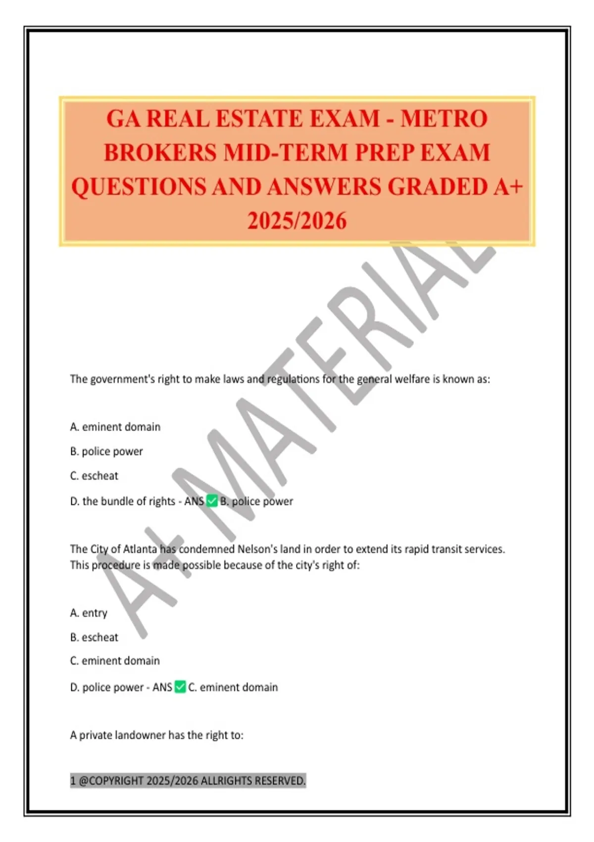 GA REAL ESTATE EXAM - METRO BROKERS MID-TERM PREP EXAM QUESTIONS AND ANSWERS GRADED A+ 2025/2026