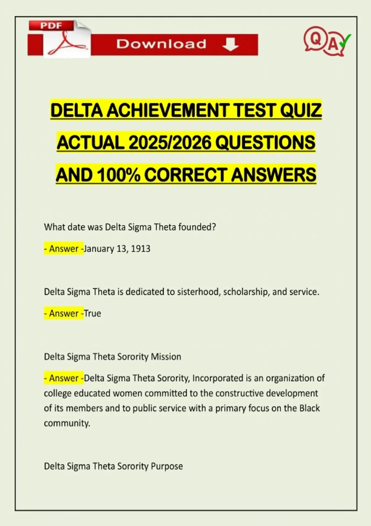 DELTA ACHIEVEMENT TEST QUIZ ACTUAL 2025/2026 QUESTIONS AND 100% CORRECT ANSWERS What date was Delta Sigma Theta founded? - Answer -January 13, 1913 Delta Sigma Theta is dedicated to sisterhood, scholarship, and service. - Answer -True Delta Sigma Theta Sorority Mission - Answer -Delta Sigma Theta Sorority, Incorporated is an organization of college educated women committed to the constructive development of its members and to public service with a primary focus on the Black community.