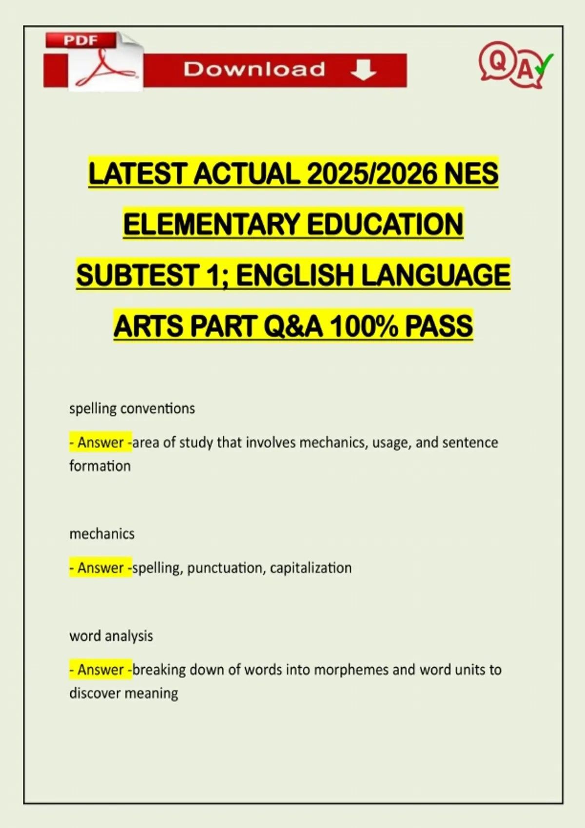 LATEST ACTUAL 2026 NES ELEMENTARY EDUCATION SUBTEST 1; ENGLISH LANGUAGE ARTS PART Q&A 100% PASS