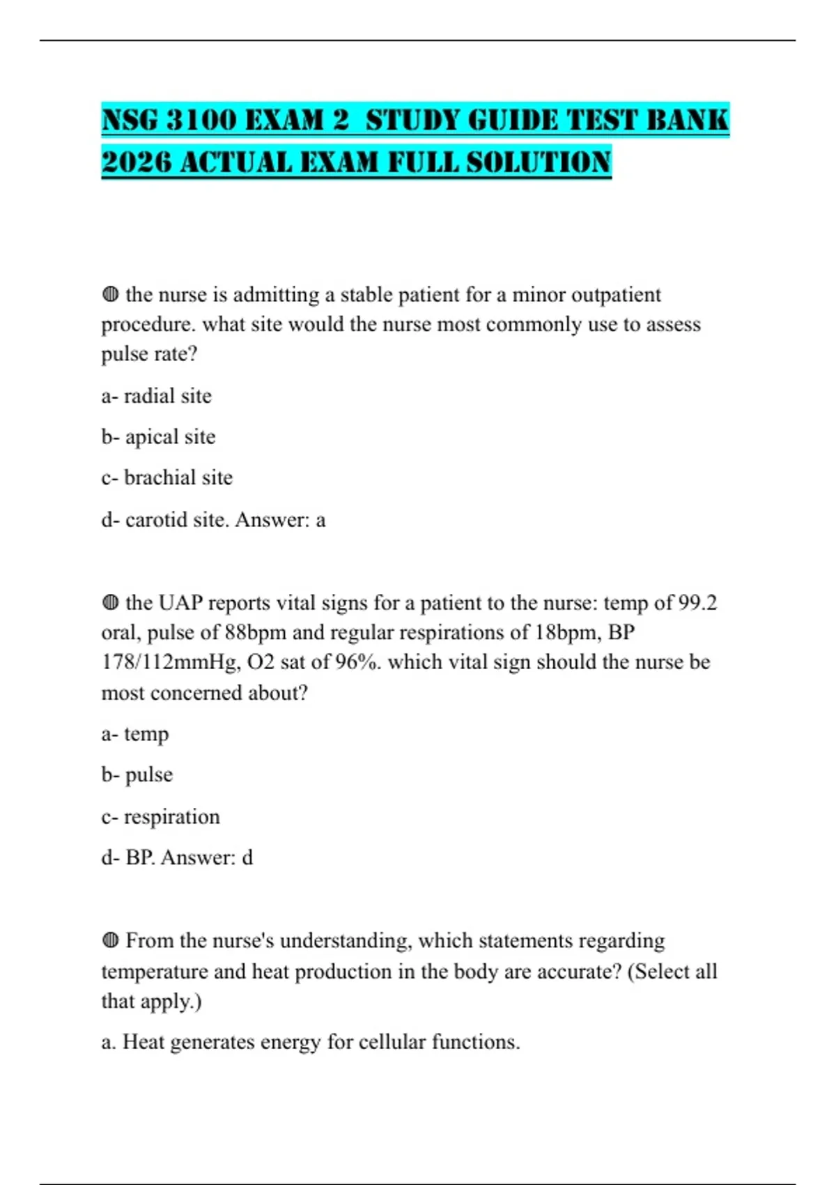 NSG 3100 EXAM 2 STUDY GUIDE TEST BANK 2026 ACTUAL EXAM FULL SOLUTION