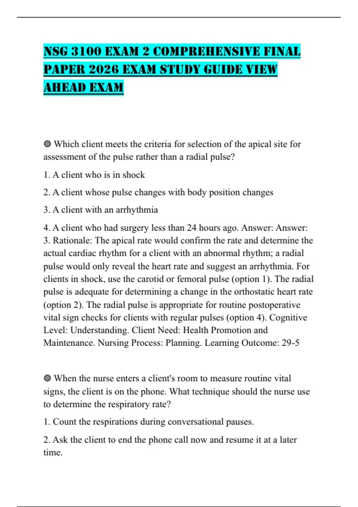 NSG 3100 EXAM 2 COMPREHENSIVE FINAL PAPER 2026 EXAM STUDY GUIDE VIEW AHEAD EXAM
