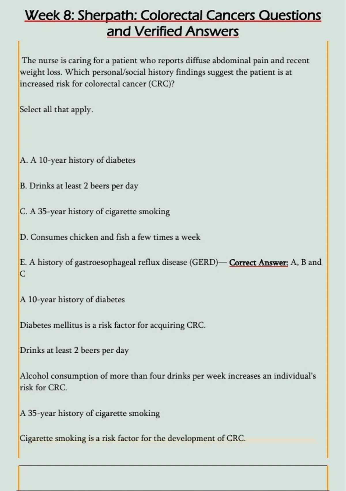 Week 8: Sherpath: Colorectal Cancers Questions and Verified Answers