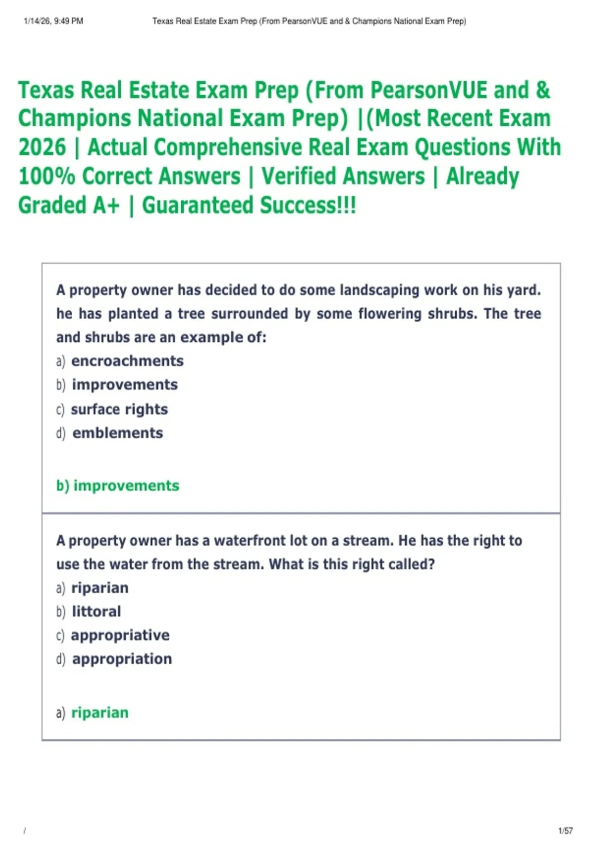 Texas Real Estate Exam Prep (From PearsonVUE and & Champions National Exam Prep) |(Most Recent Exam 2026 | Actual Comprehensive Real Exam Questions With 100% Correct Answers | Verified Answers | Already Graded A+ | Guaranteed Success!!! Texas Real Estate Exam Prep (From PearsonVUE and & Champions National Exam Prep) |(Most Recent Exam 2026 | Actual Comprehensive Real Exam Questions With 100% Correct Answers | Verified Answers | Already Graded A+ | Guaranteed Success!!! Texas Real Estate Exam Prep (From PearsonVUE and & Champions National Exam Prep) |(Most Recent Exam 2026 | Actual Comprehensive Real Exam Questions With 100% Correct Answers | Verified Answers | Already Graded A+ | Guaranteed Success!!! Texas Real Estate Exam Prep (From PearsonVUE and & Champions National Exam Prep) |(Most Recent Exam 2026 | Actual Comprehensive Real Exam Questions With 100% Correct Answers | Verified Answers | Already Graded A+ | Guaranteed Success!!! Texas Real Estate Exam Prep (From PearsonVUE and & Champions National Exam Prep) |(Most Recent Exam 2026 | Actual Comprehensive Real Exam Questions With 100% Correct Answers | Verified Answers | Already Graded A+ | Guaranteed Success!!! Texas Real Estate Exam Prep (From PearsonVUE and & Champions National Exam Prep) |(Most Recent Exam 2026 | Actual Comprehensive Real Exam Questions With 100% Correct Answers | Verified Answers | Already Graded A+ | Guaranteed Success!!!