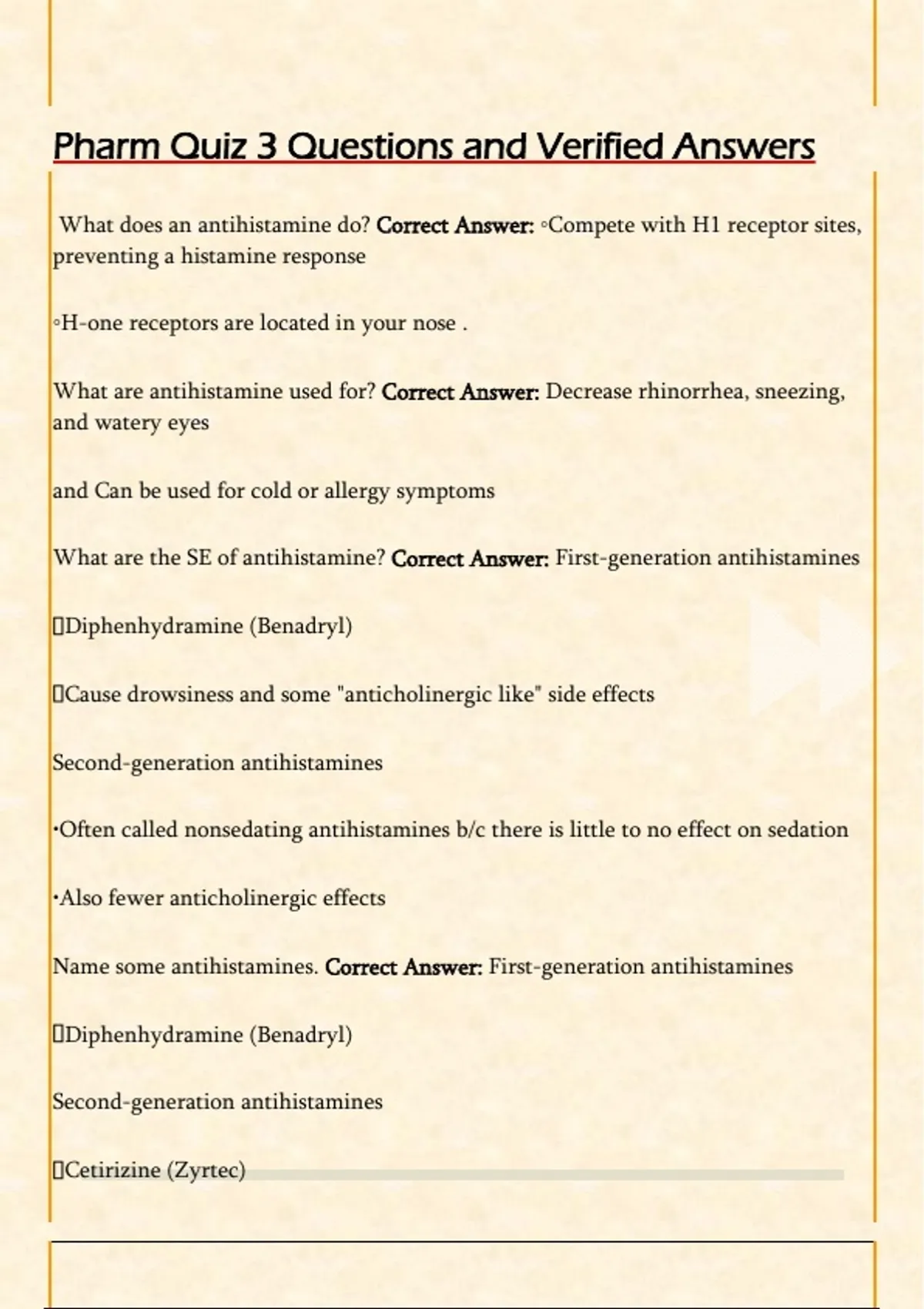 What are antihistamine used for? Correct Answer: Decrease rhinorrhea, sneezing,