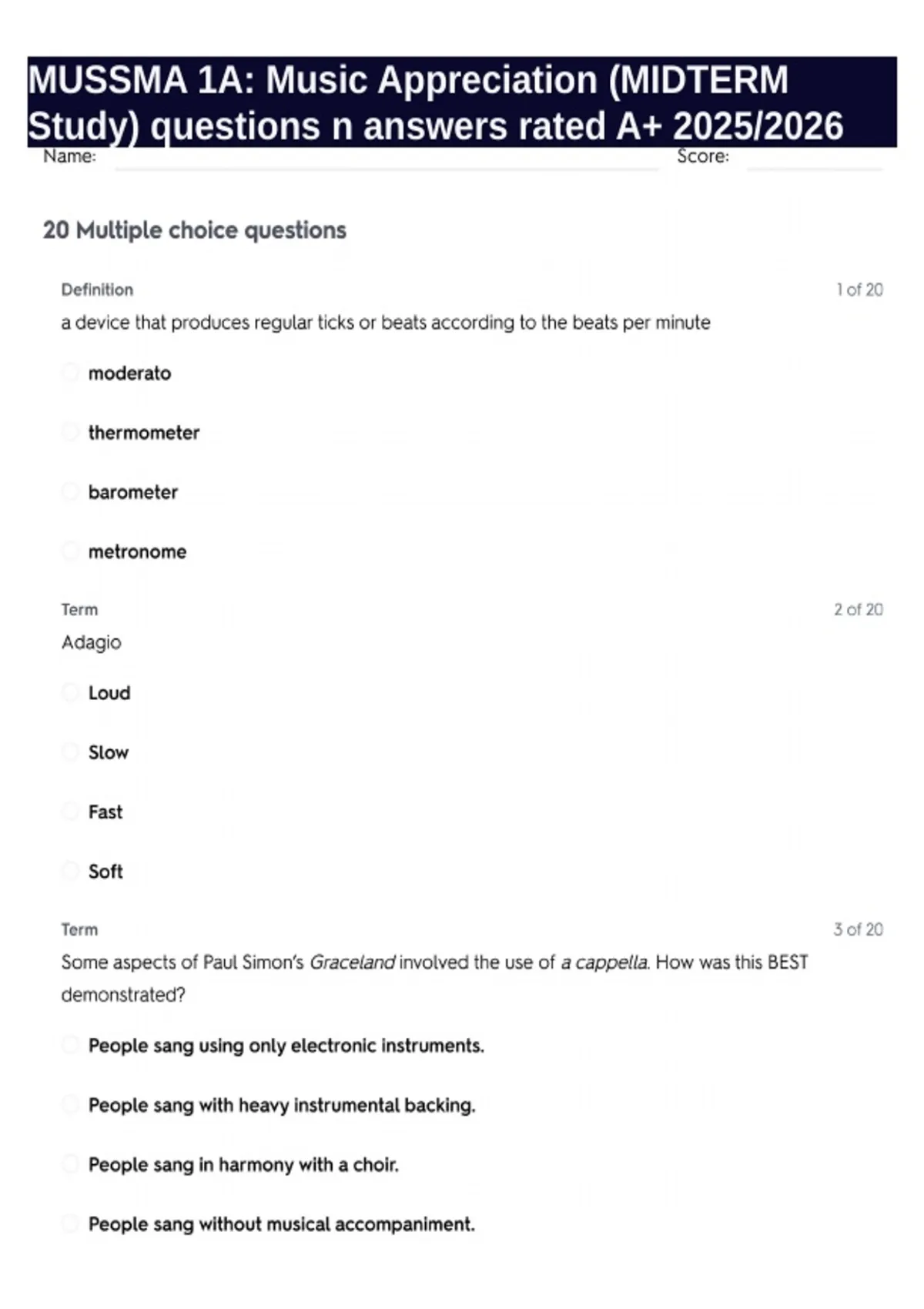 MUSSMA 1A: Music Appreciation (MIDTERM Study) questions n answers rated A+ 2025/2026