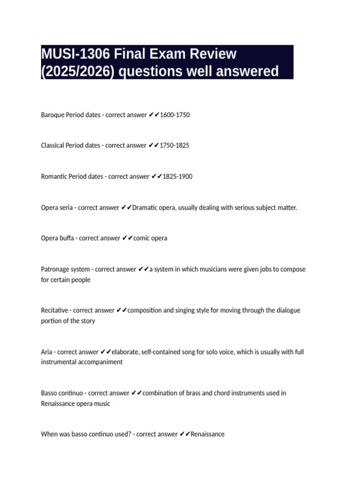 MUSI-1306 Final Exam Review (2025/2026) questions well answered