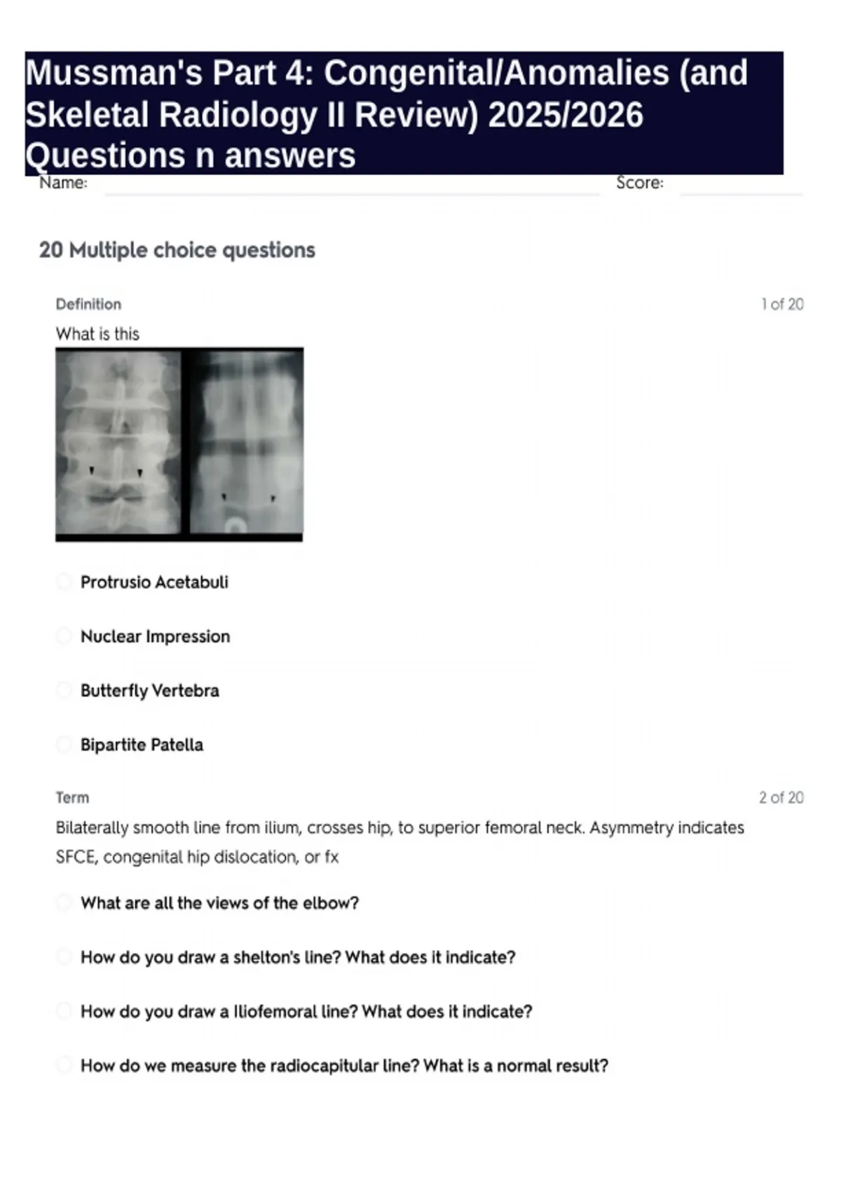 Mussman's Part 4: Congenital/Anomalies (and Skeletal Radiology II Review) 2025/2026 Questions n answers