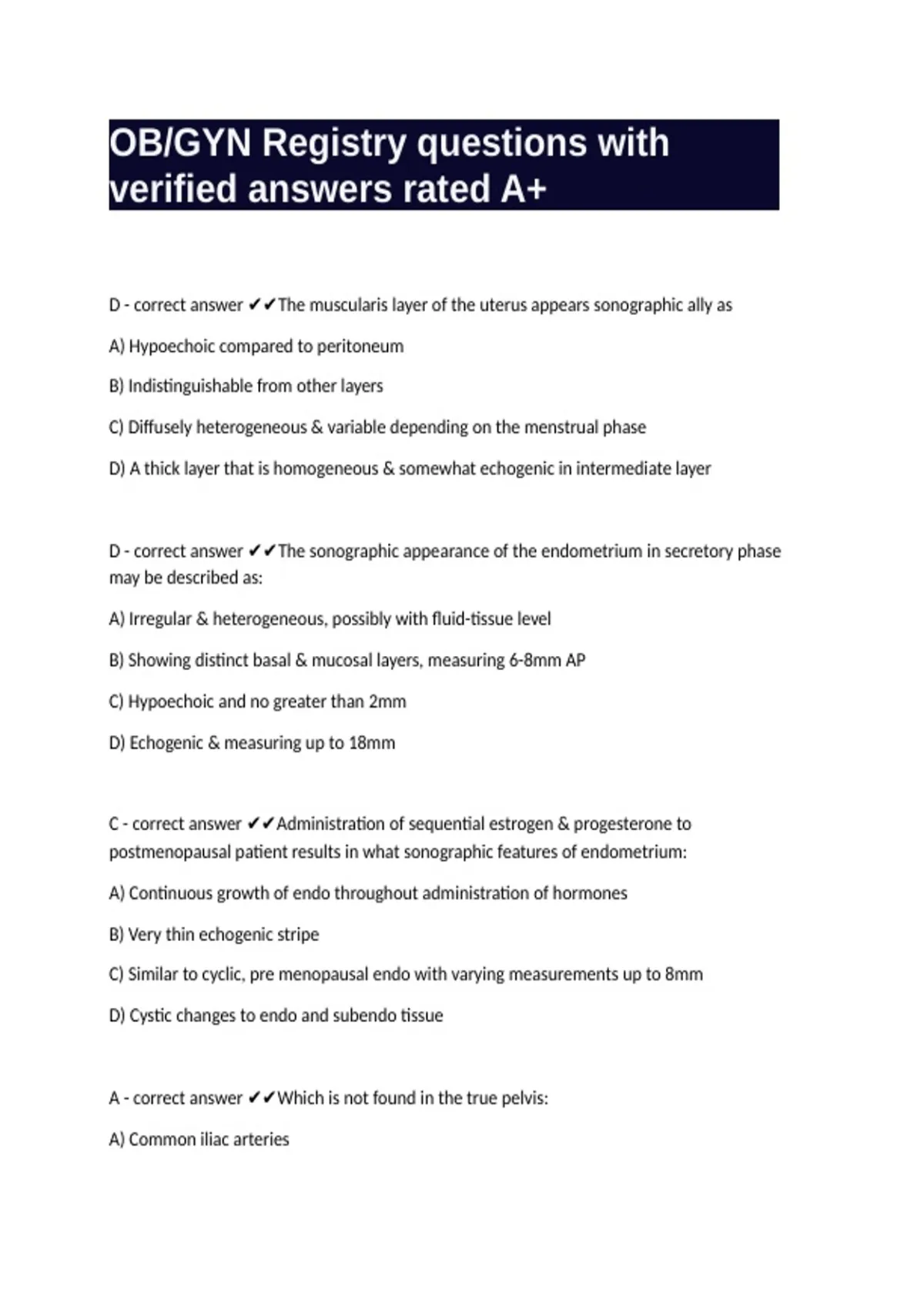 D - correct answer ✔✔The muscularis layer of the uterus appears sonographic ally as