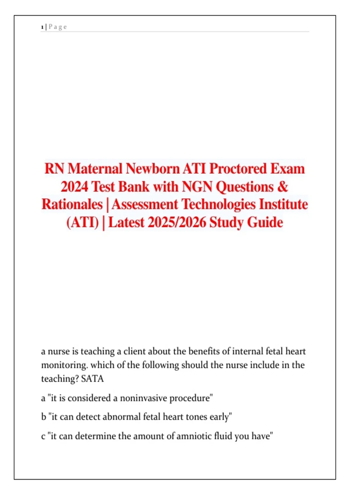 This comprehensive test bank for the RN Maternal Newborn ATI Proctored Exam 2024 includes NGN-style questions with detailed rationales and covers essential topics for maternal and newborn nursing. Aligned with the latest ATI 2025/2026 study guide, it provides practice on fetal monitoring, labor stages, pregnancy complications, pharmacologic management, newborn care, and more. Ideal for nursing students preparing for the ATI proctored exam, this resource helps reinforce clinical judgment and content mastery for real-world maternal-newborn nursing scenarios