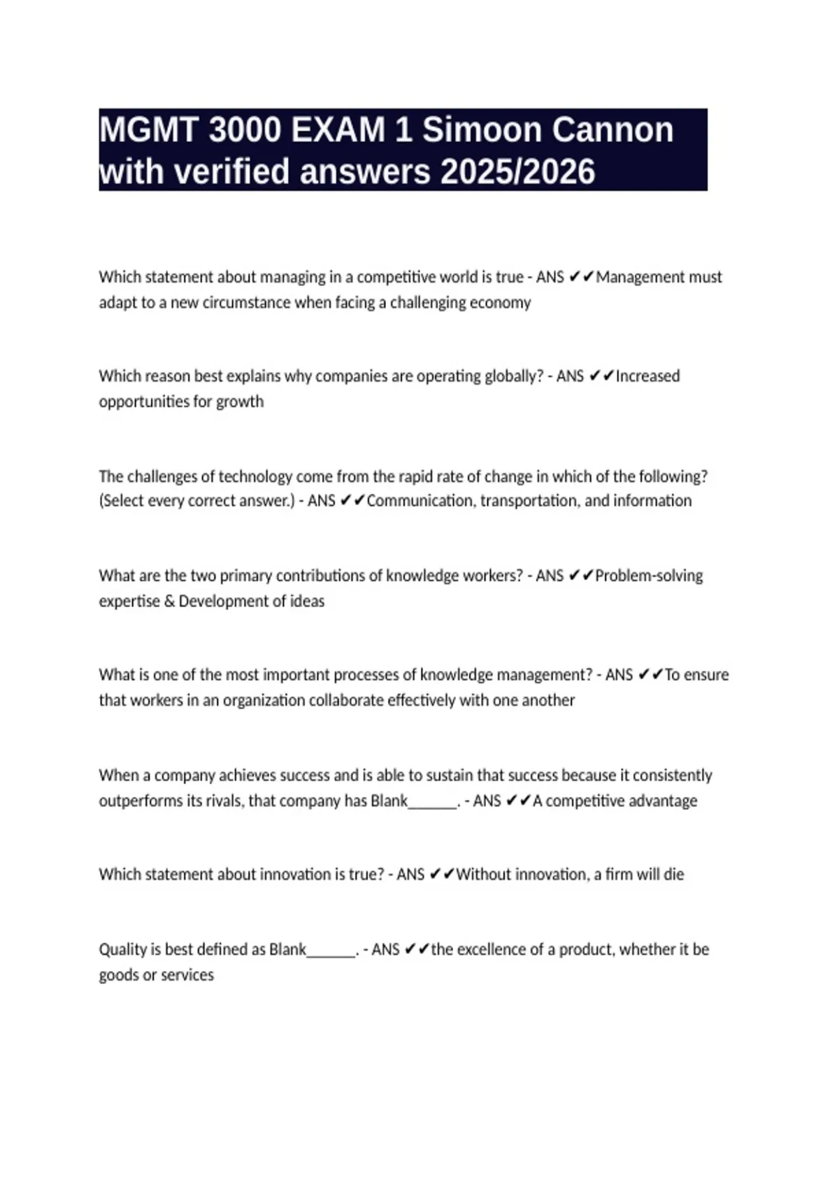 MGMT 3000 EXAM 1 Simoon Cannon with verified answers 2025/2026