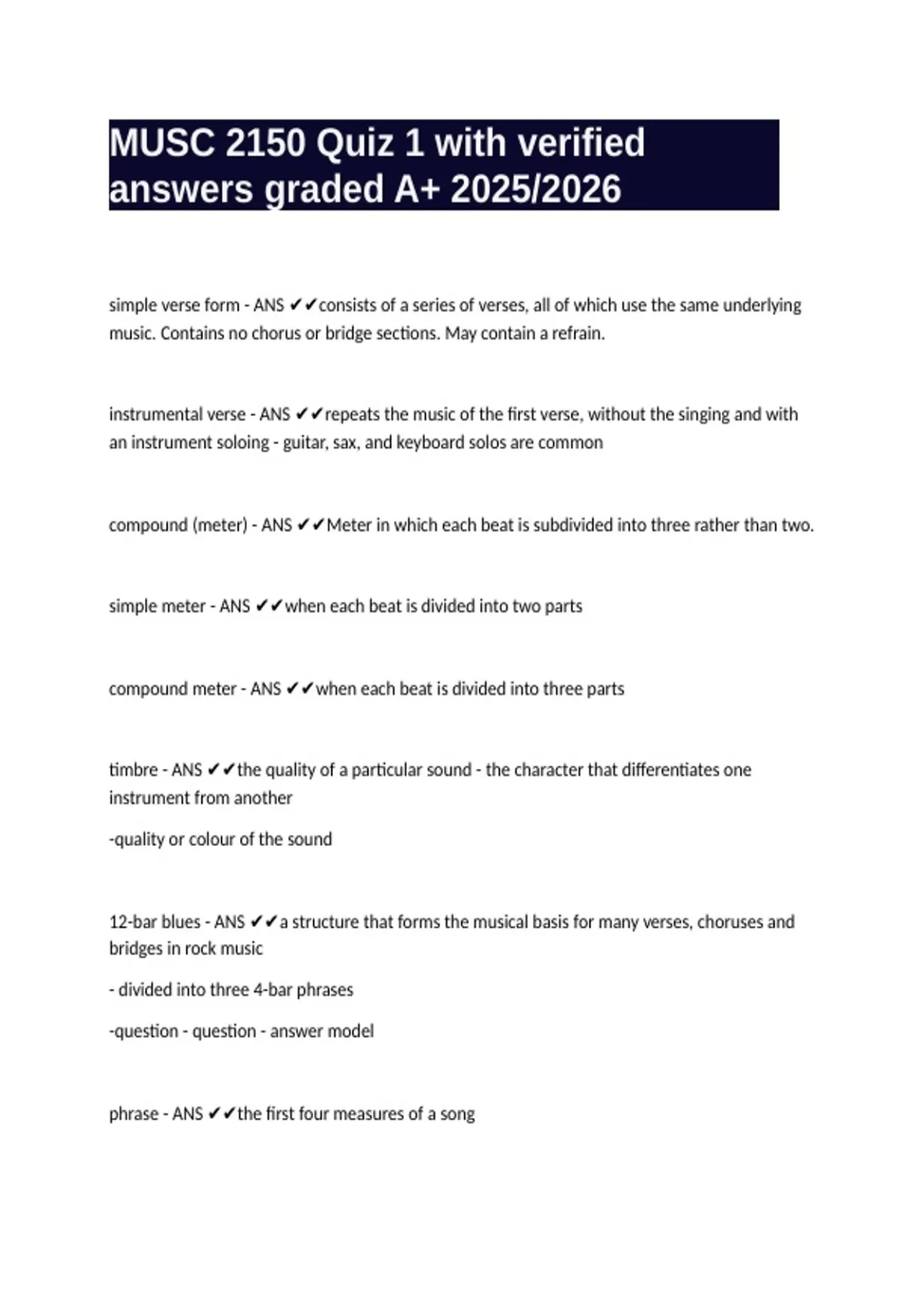 MUSC 2150 Quiz 1 with verified answers graded A+ 2025/2026