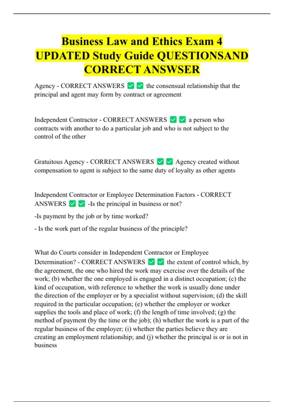 Business Law and Ethics Exam 4 UPDATED Study Guide QUESTIONSAND CORRECT ANSWSER
