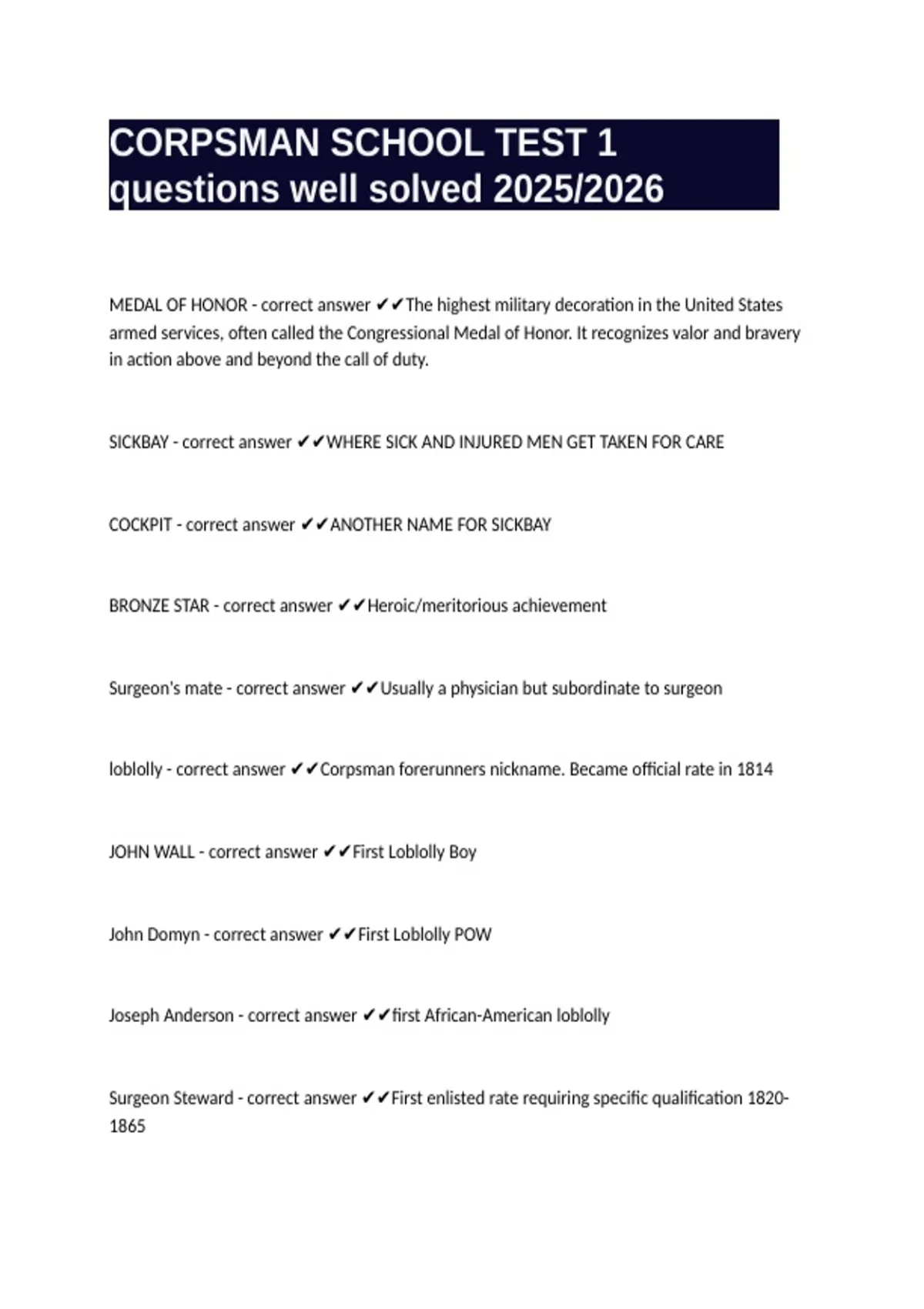 CORPSMAN SCHOOL TEST 1 questions well solved 2025/2026