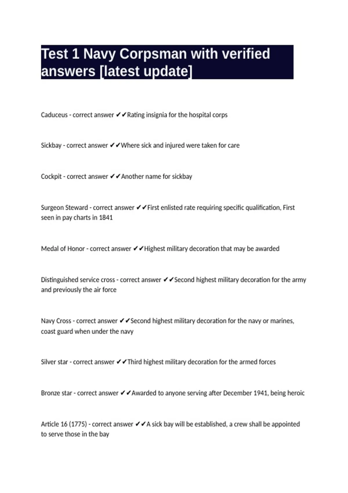 Test 1 Navy Corpsman with verified answers -latest update