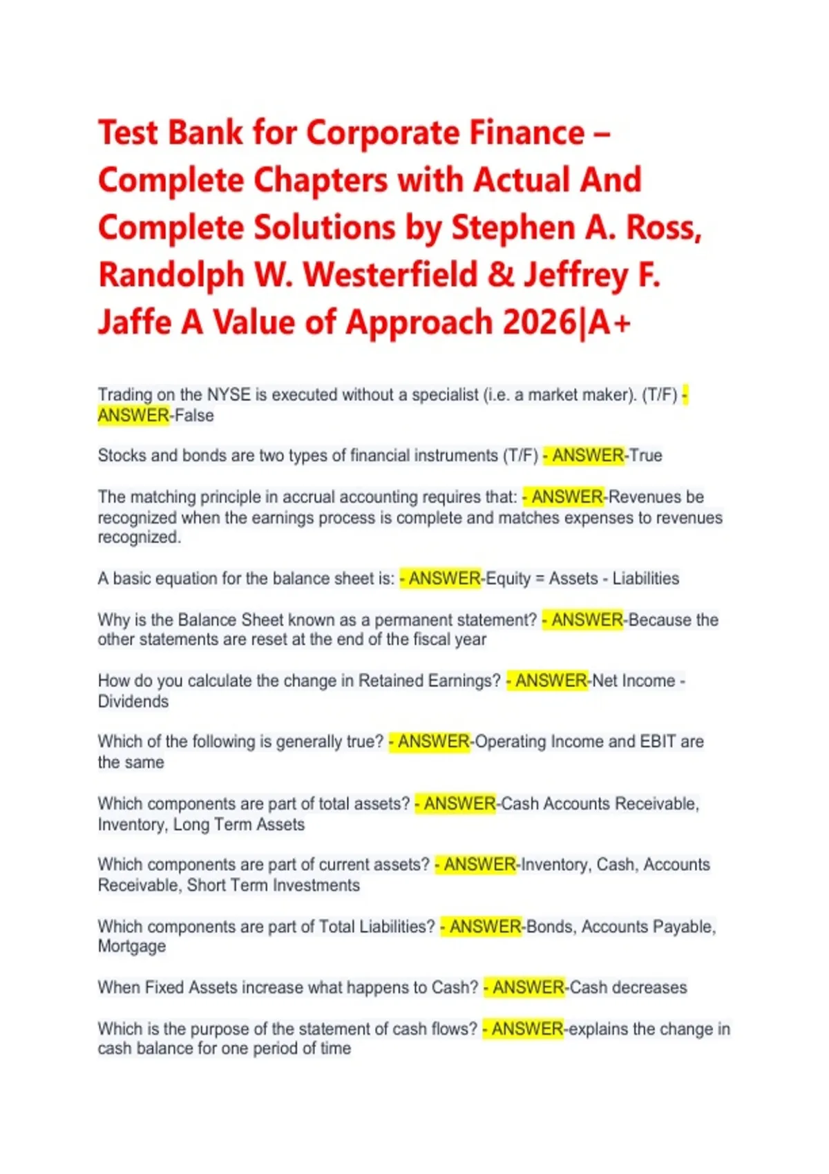 Get the complete Test Bank for Corporate Finance by Ross, Westerfield & Jaffe (2026). All chapters with actual solutions, step-by-step answers, and A+ prep for exam 2026 Test Bank for Corporate Finance: Ross Westerfield Jaffe "A Value of Approach." Includes every chapter & verified solutions for top grades.
