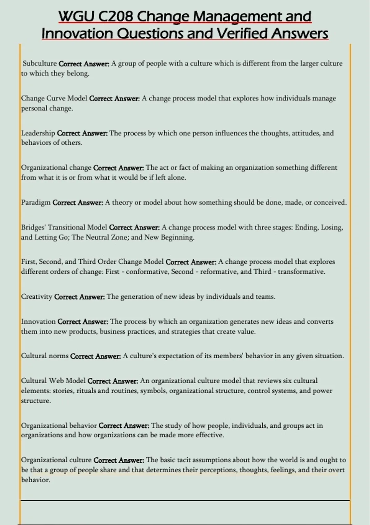 WGU C208 Change Management and Innovation Questions and Verified Answers