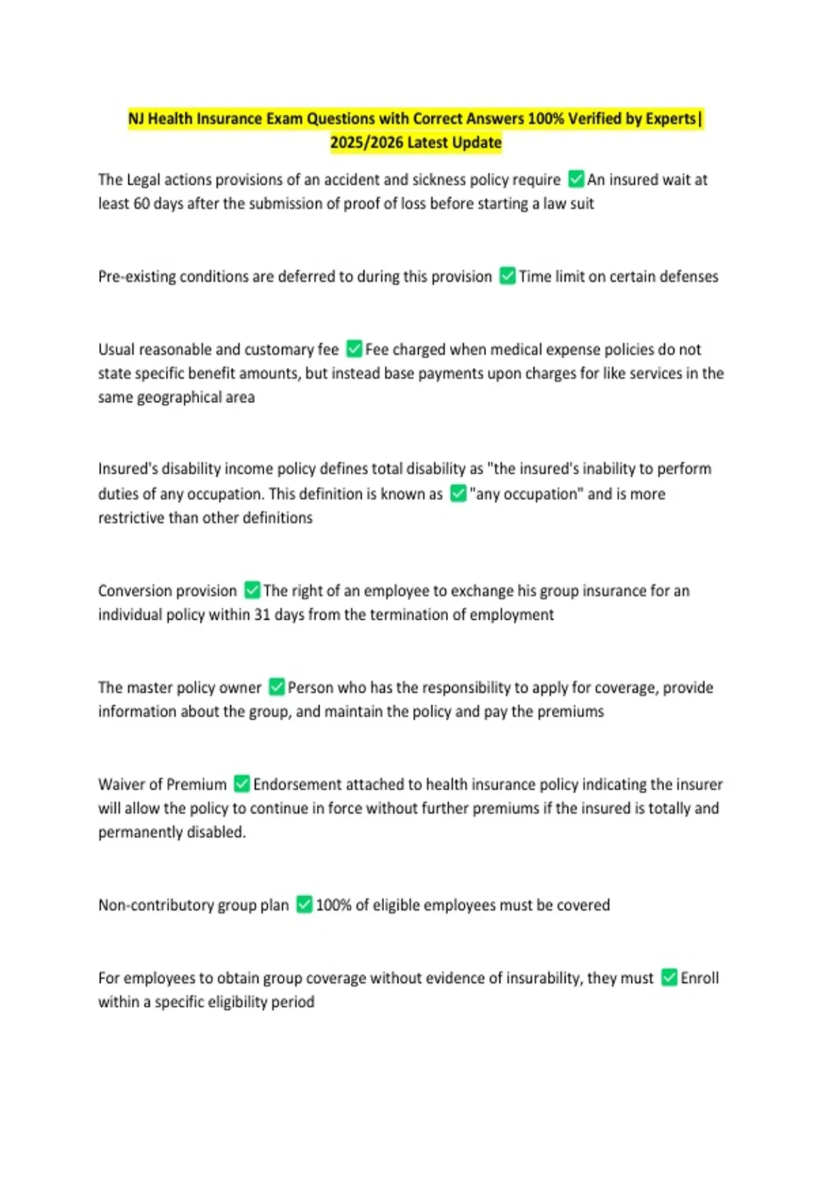 NJ Health Insurance Exam Questions with Correct Answers 100% Verified by Experts|