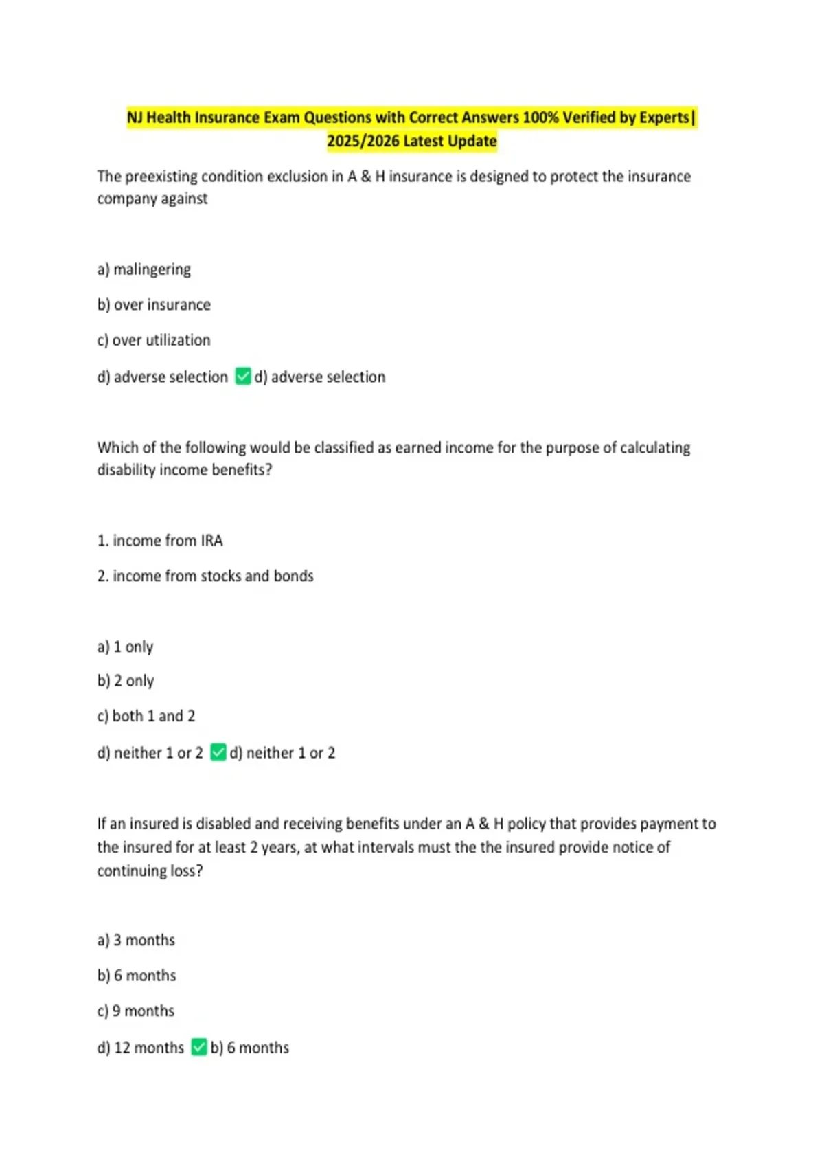 NJ Health Insurance Exam Questions with Correct Answers 100% Verified by Experts|