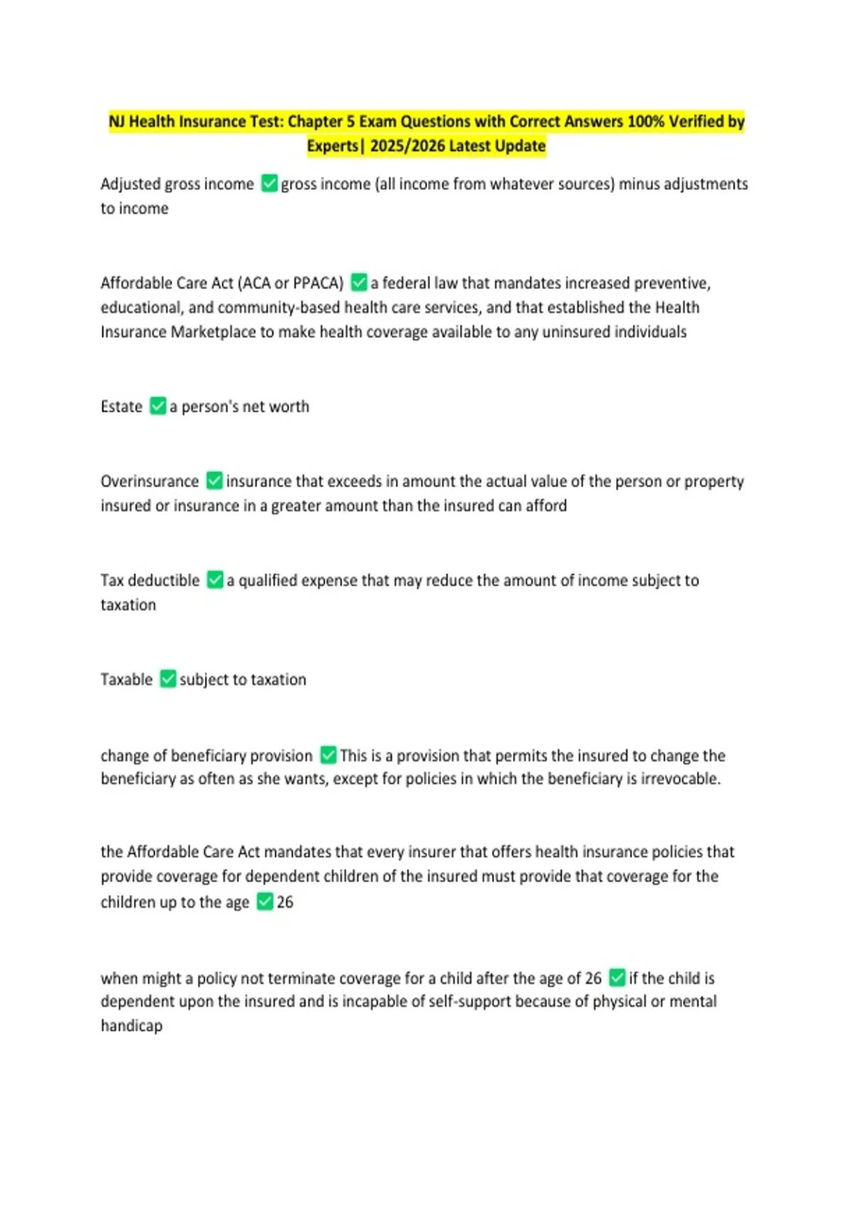 NJ Health Insurance Test: Chapter 5 Exam Questions with Correct Answers 100% Verified by