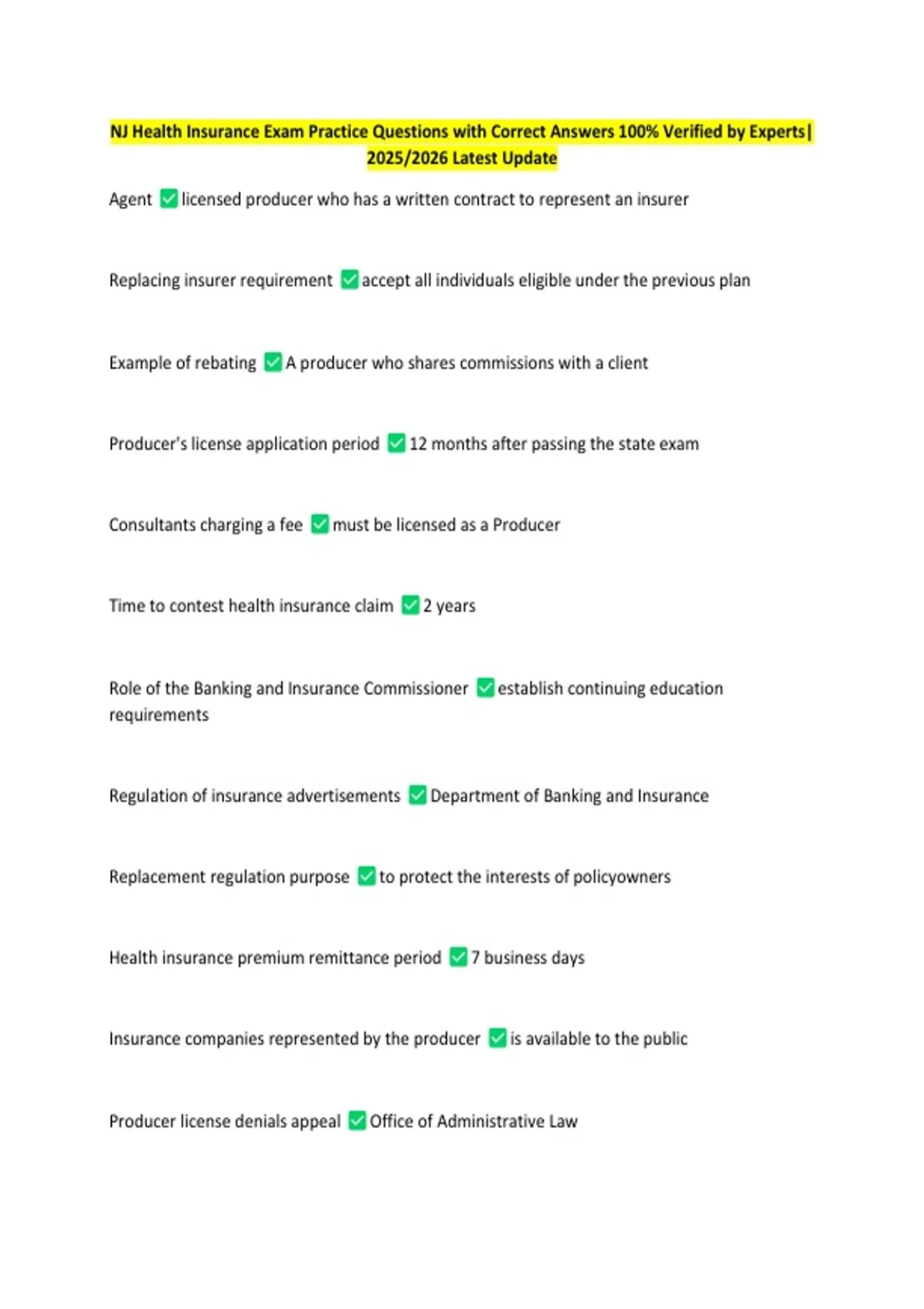 NJ Health Insurance Exam Practice Questions with Correct Answers 100% Verified by Experts|