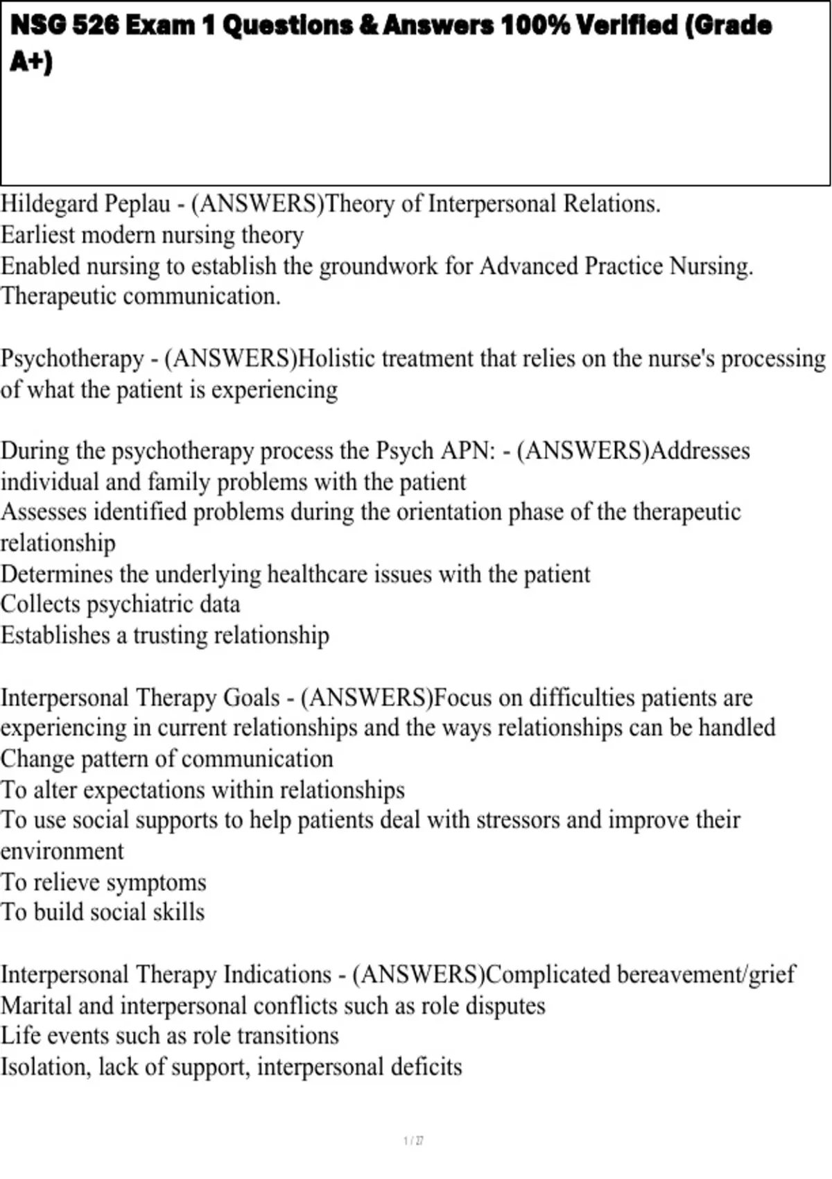 , NSG 526 Exam 1 Questions & Answers 100% Verified (Grade