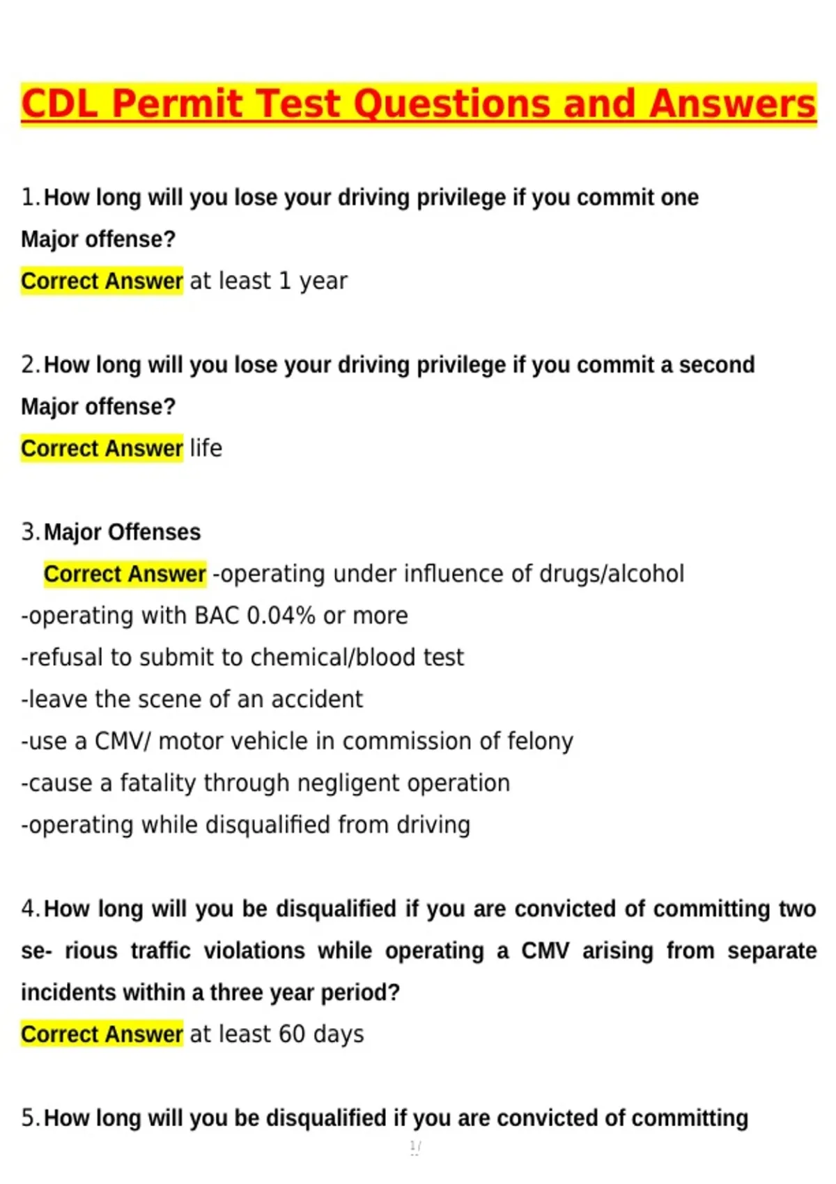CDL Permit Test (Latest 2026 / 2027 Update) Questions and Verified Answers | 100% Correct | Grade A+