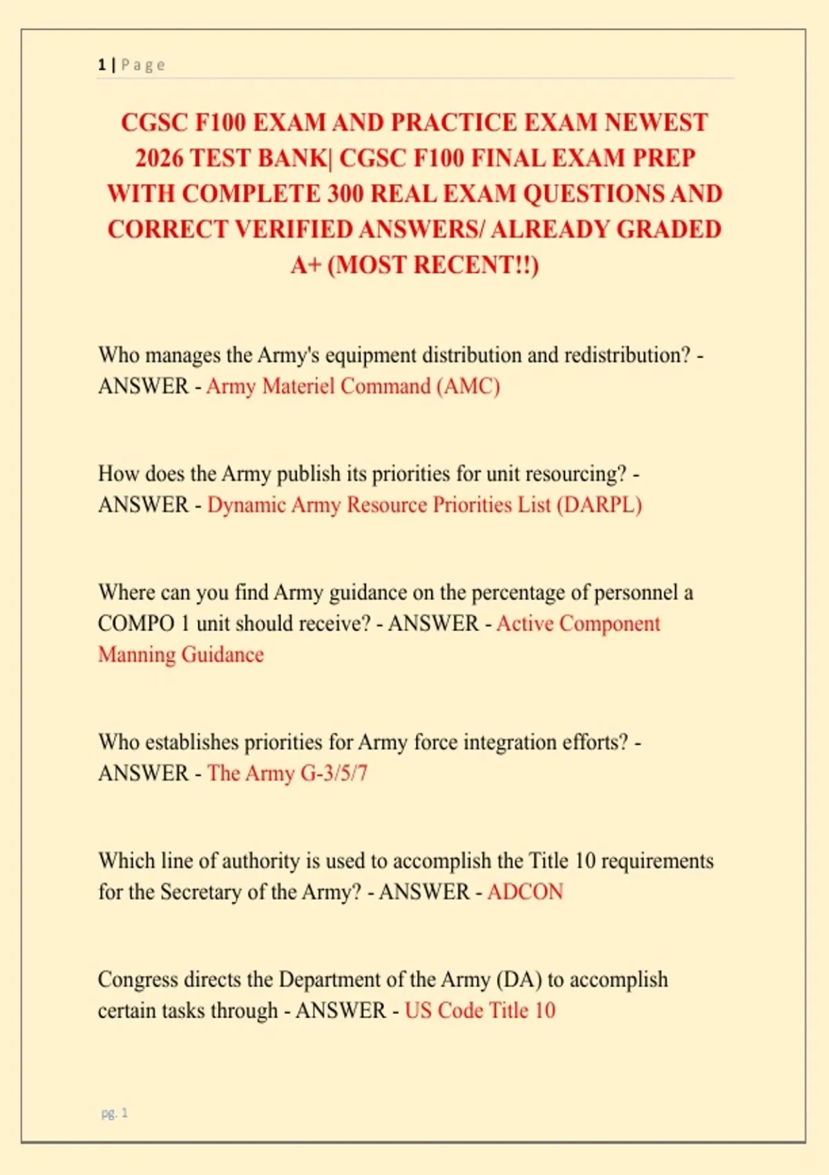 CGSC F100 EXAM AND PRACTICE EXAM NEWEST 2026 TEST BANK| CGSC F100 FINAL EXAM PREP WITH COMPLETE 300 REAL EXAM QUESTIONS AND CORRECT VERIFIED ANSWERS/ ALREADY GRADED A+ (MOST RECENT!!)