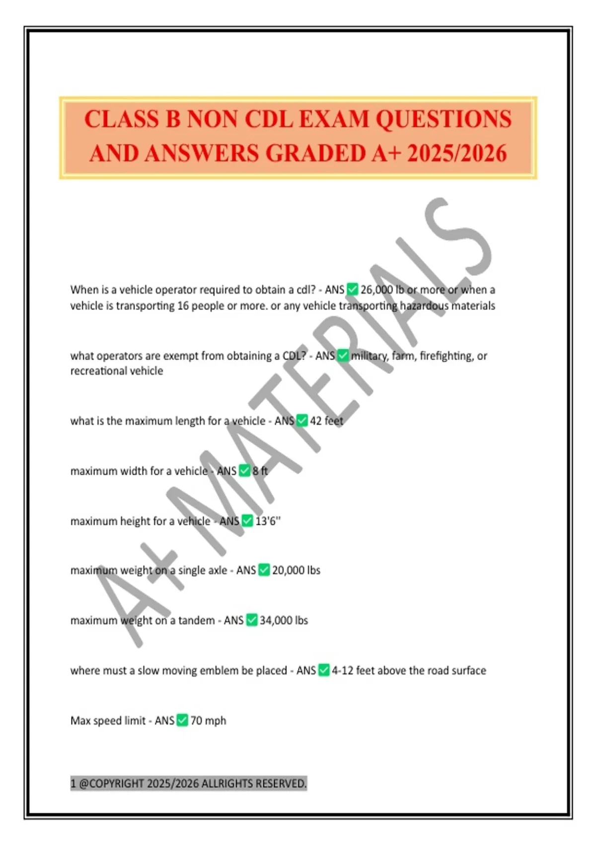 CLASS B NON CDL EXAM QUESTIONS AND ANSWERS GRADED A+ 2025/2026