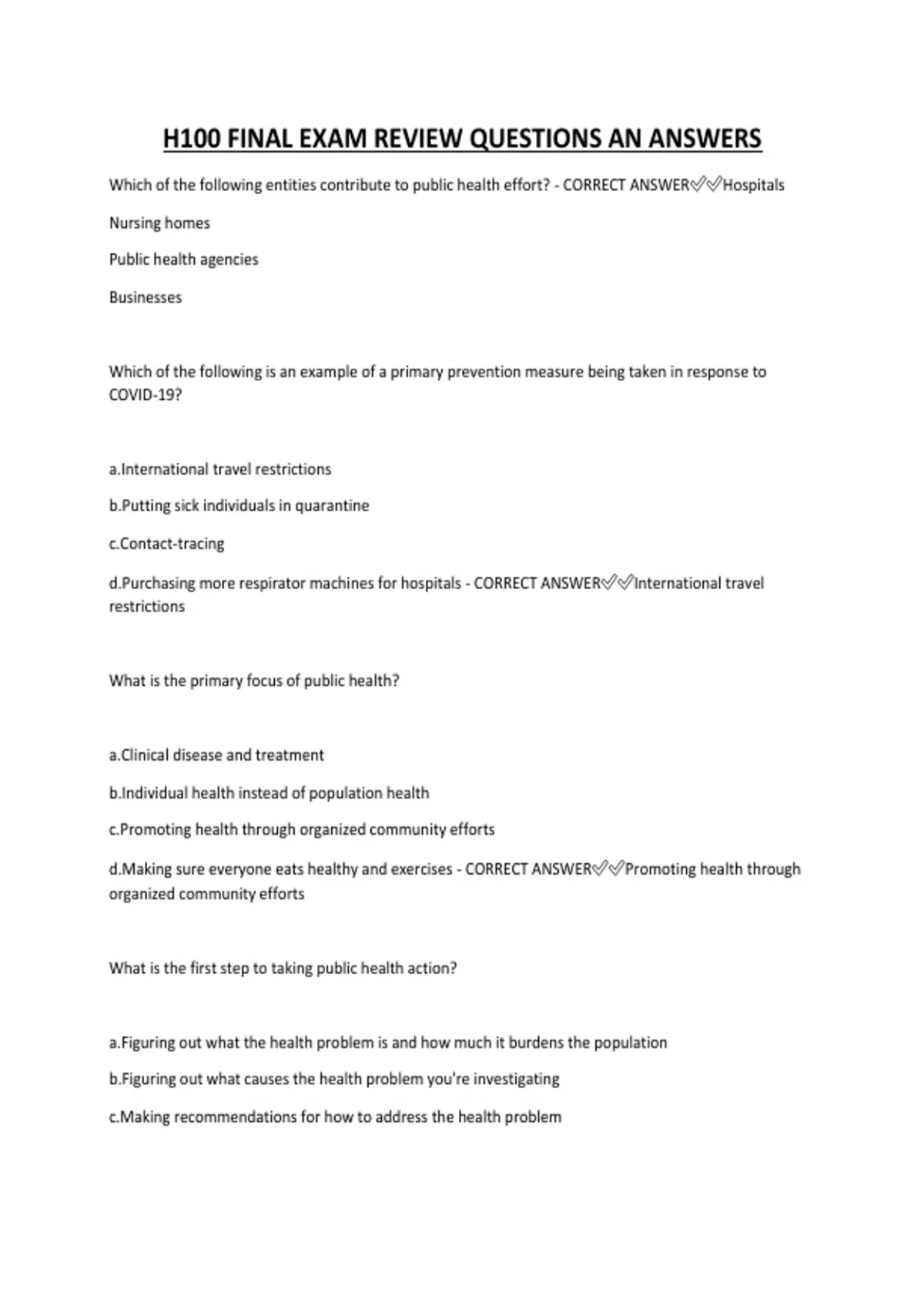 H100 FINAL EXAM REVIEW QUESTIONS AN ANSWERS Which of the following entities contribute to public health effort? - CORRECT ANSWERHospitals Nursing homes Public health agencies Businesses