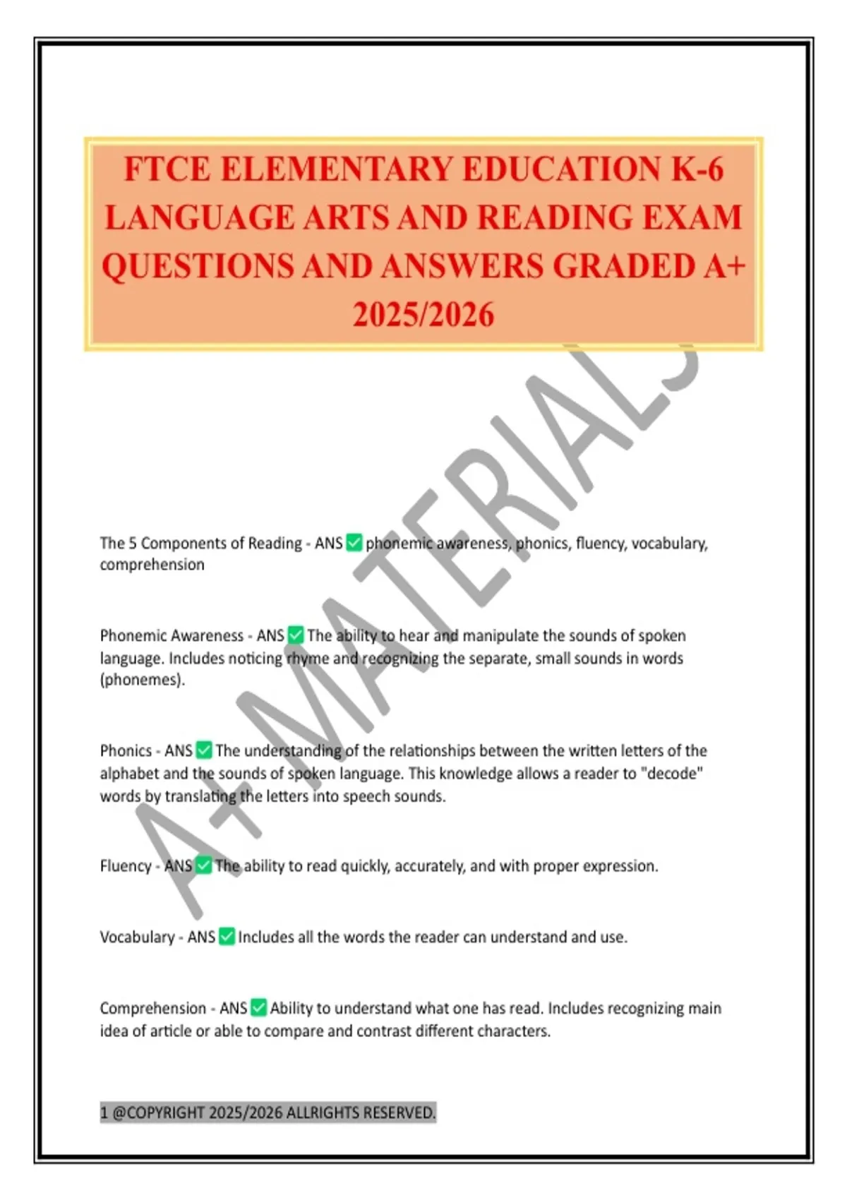 FTCE ELEMENTARY EDUCATION K-6 LANGUAGE ARTS AND READING EXAM QUESTIONS AND ANSWERS GRADED A+ 2025/2026