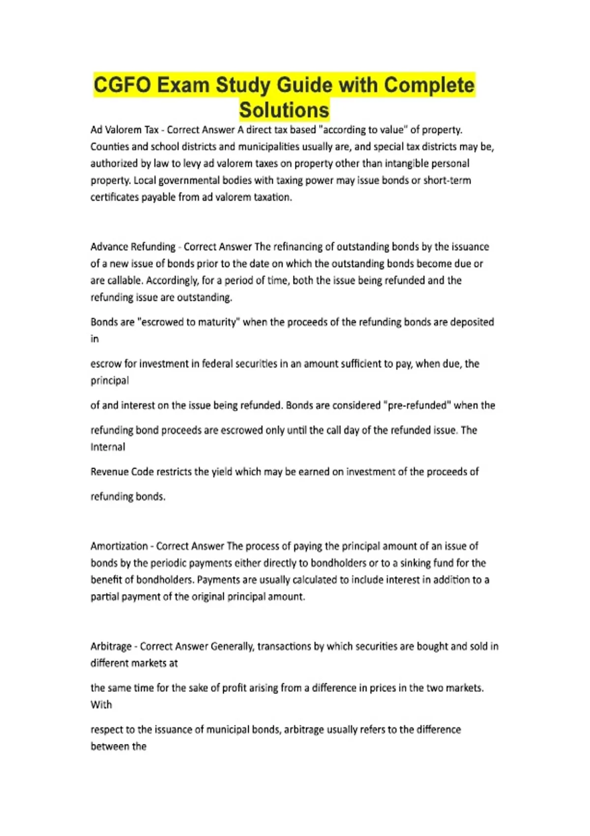 CGFO Exam Study Guide with Complete Solutions Ad Valorem Tax - Correct Answer A direct tax based "according to value" of property. Counties and school districts and municipalities usually are, and special tax districts may be, authorized by law to levy ad valorem taxes on property other than intangible personal property. Local governmental bodies with taxing power may issue bonds or short-term certificates payable from ad valorem taxation. Advance Refunding - Correct Answer The refinancing of outstanding bonds by the issuance of a new issue of bonds prior to the date on which the outstanding bonds become due or are callable. Accordingly, for a period of time, both the issue being refunded and the refunding issue are outstanding. Bonds are "escrowed to maturity" when the proceeds of the refunding bonds are deposited in escrow for investment in federal securities in an amount sufficient to pay, when due, the principal of and interest on the issue being refunded. Bonds are considered "pre-refunded" when the refunding bond proceeds are escrowed only until the call day of the refunded issue. The Internal Revenue Code restricts the yield which may be earned on investment of the proceeds of refunding bonds. Amortization - Correct Answer The process of paying the principal amount of an issue of bonds by the periodic payments either directly to bondholders or to a sinking fund for the benefit of bondholders. Payments are usually calculated to include interest in addition to a partial payment of the original principal amount. Arbitrage - Correct Answer Generally, transactions by which securities are bought and sold in different markets at the same time for the sake of profit arising from a difference in prices in the two markets. With respect to the issuance of municipal bonds, arbitrage usually refers to the difference between the interest paid