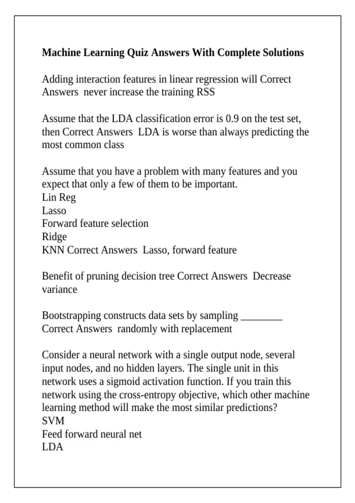 Machine Learning Quiz Answers With Complete Solutions