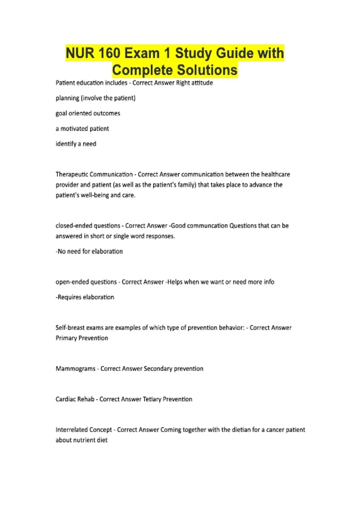 NUR 160 Exam 1 Study Guide with Complete Solutions Patient education includes - Correct Answer Right attitude planning (involve the patient) goal oriented outcomes a motivated patient identify a need Therapeutic Communication - Correct Answer communication between the healthcare provider and patient (as well as the patient's family) that takes place to advance the patient's well-being and care. closed-ended questions - Correct Answer -Good communcation Questions that can be answered in short or single word responses. -No need for elaboration open-ended questions - Correct Answer -Helps when we want or need more info -Requires elaboration Self-breast exams are examples of which type of prevention behavior: - Correct Answer Primary Prevention Mammograms - Correct Answer Secondary prevention Cardiac Rehab - Correct Answer Tetiary Prevention Interrelated Concept - Correct Answer Coming together with the dietian for a cancer patient about nutrient diet