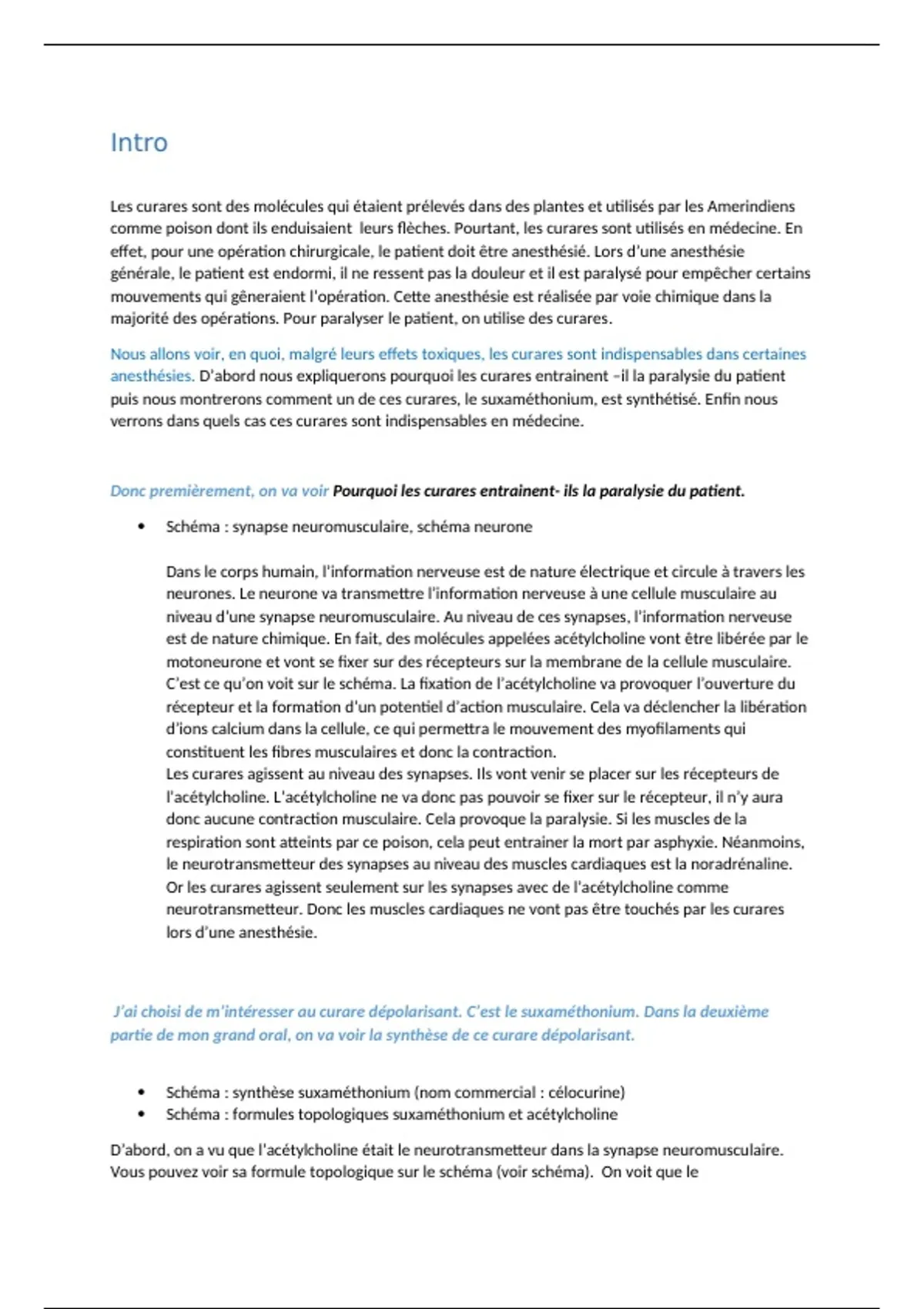 Il s'agit d'un sujet de grand oral entièrement rédigé et vérifié avec mes professeurs. C'est un sujet de Chimie SVT qui parle de l'utilisation des curares en anesthésie. Il est parfaitement adapté au programme de terminale et fait un lien avec la médecine.