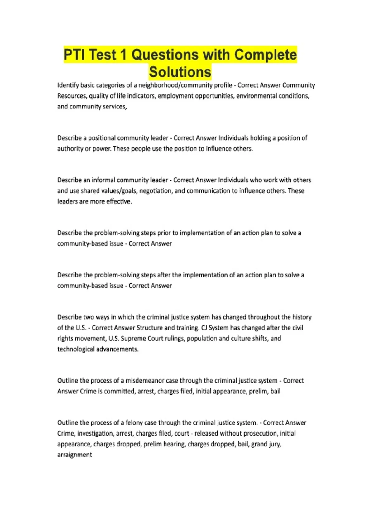 PTI Test 1 Questions with Complete Solutions Identify basic categories of a neighborhood/community profile - Correct Answer Community Resources, quality of life indicators, employment opportunities, environmental conditions, and community services, Describe a positional community leader - Correct Answer Individuals holding a position of authority or power. These people use the position to influence others. Describe an informal community leader - Correct Answer Individuals who work with others and use shared values/goals, negotiation, and communication to influence others. These leaders are more effective. Describe the problem-solving steps prior to implementation of an action plan to solve a community-based issue - Correct Answer Describe the problem-solving steps after the implementation of an action plan to solve a community-based issue - Correct Answer Describe two ways in which the criminal justice system has changed throughout the history of the U.S. - Correct Answer Structure and training. CJ System has changed after the civil rights movement, U.S. Supreme Court rulings, population and culture shifts, and technological advancements. Outline the process of a misdemeanor case through the criminal justice system - Correct Answer Crime is committed, arrest, charges filed, initial appearance, prelim, bail Outline the process of a felony case through the criminal justice system. - Correct Answer Crime, investigation, arrest, charges filed, court - released without prosecution, initial appearance, charges dropped, prelim hearing, charges dropped, bail, grand jury, arraignment